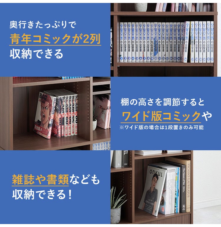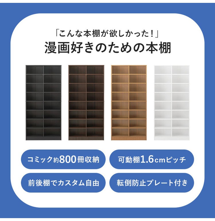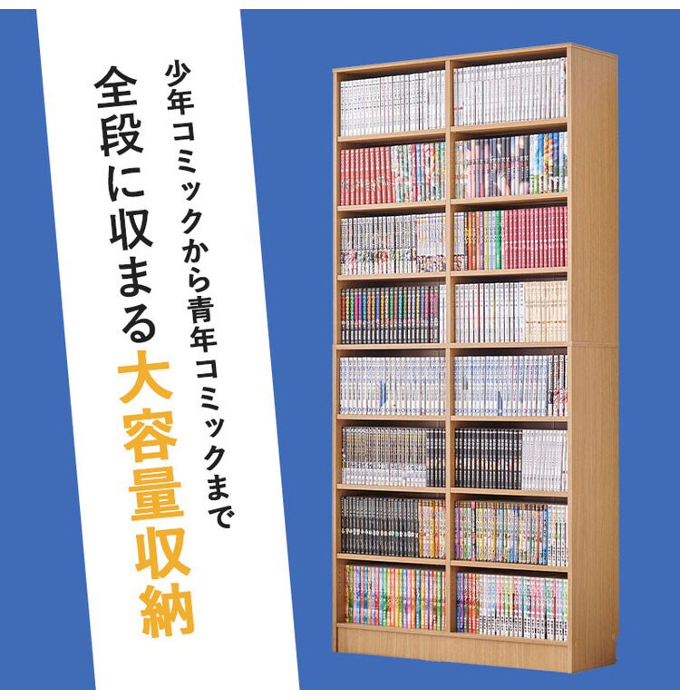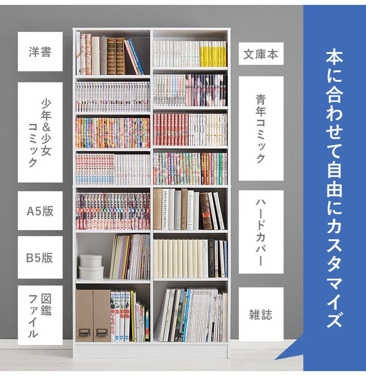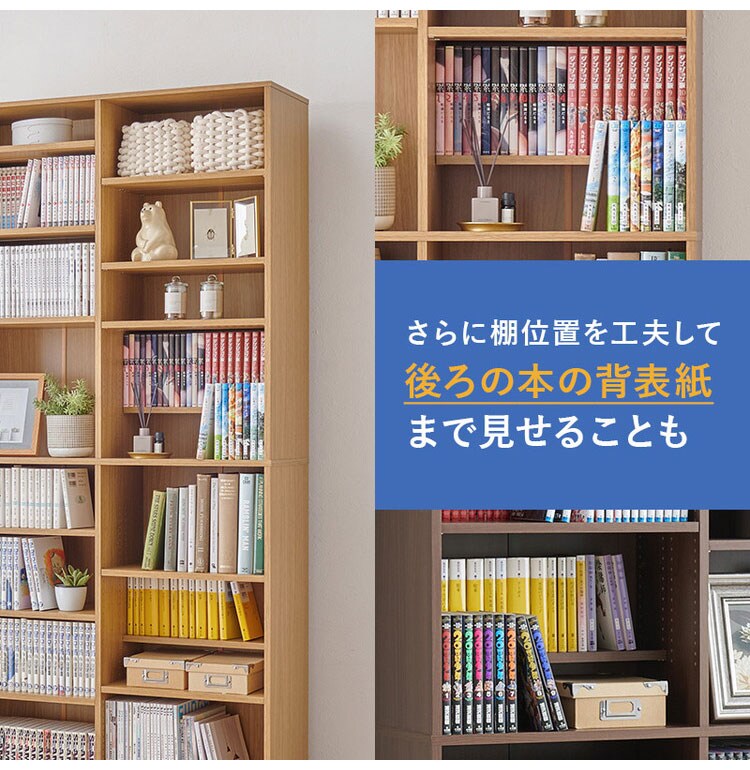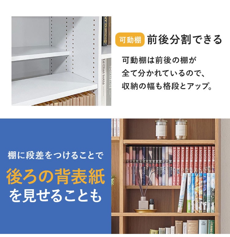 前後2列別々に棚板高さが変えられ、大容量収納できるマンガ好きの為の本棚