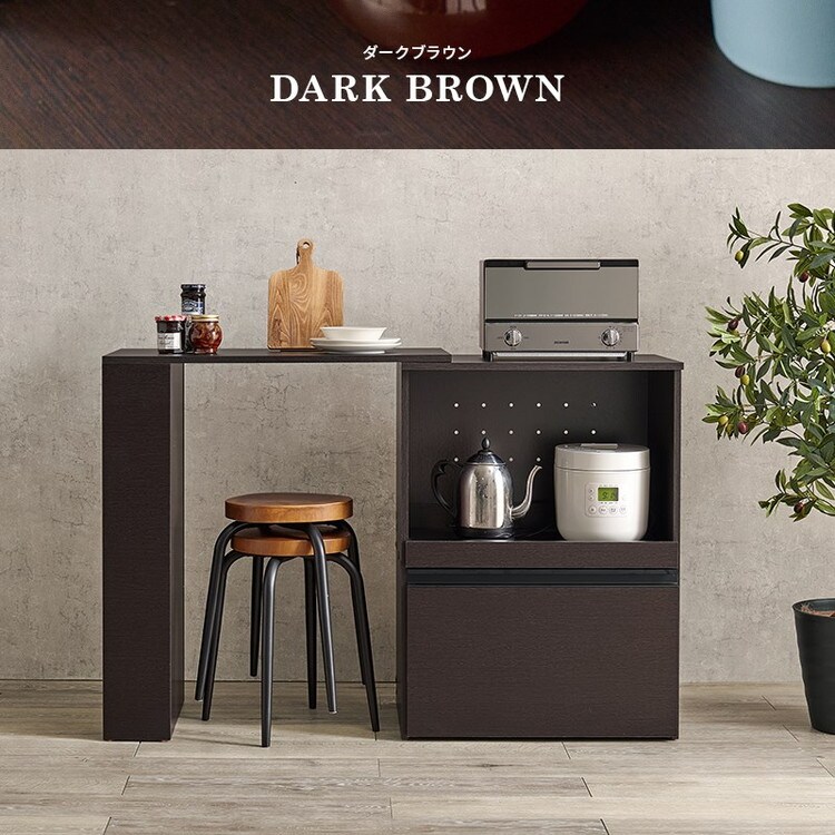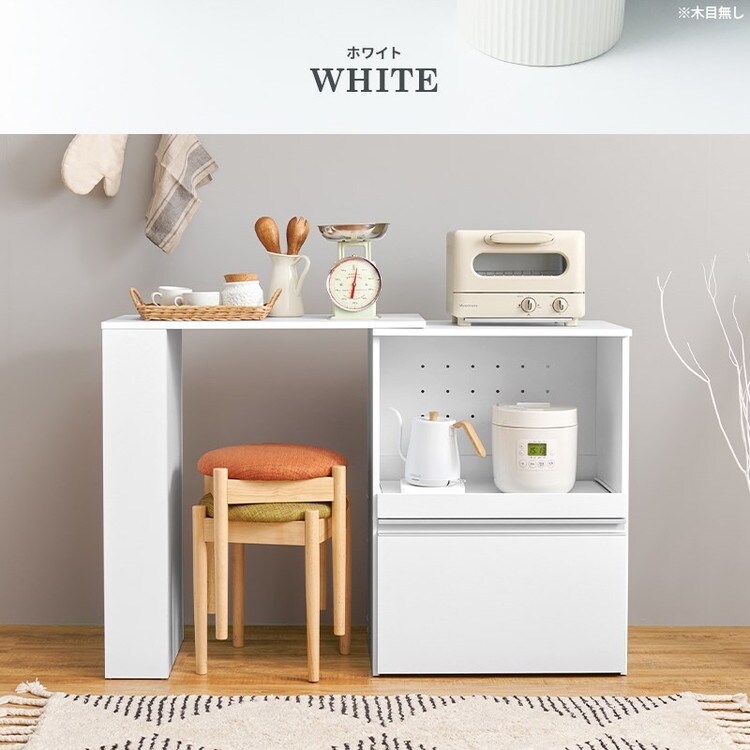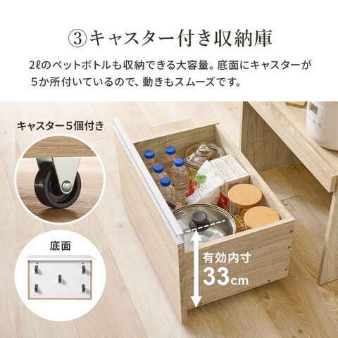 お部屋の広さや収納するものに合わせて幅を調整できるカウンターキャビネット。食器や調理器具、キッチン家電などがスッキリ片付きます。ワゴン収納庫タイプ