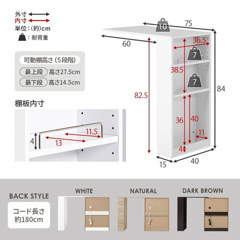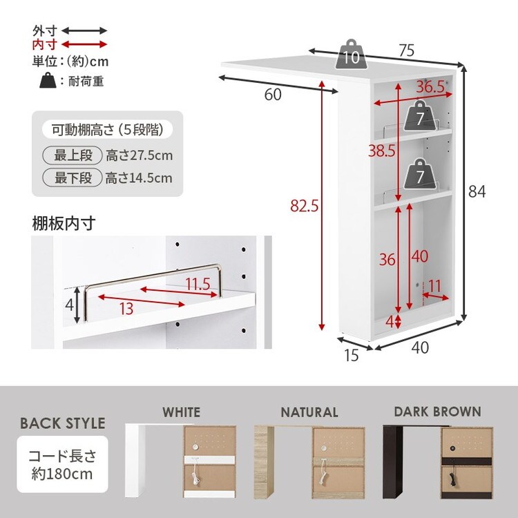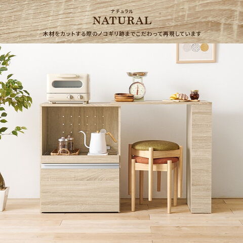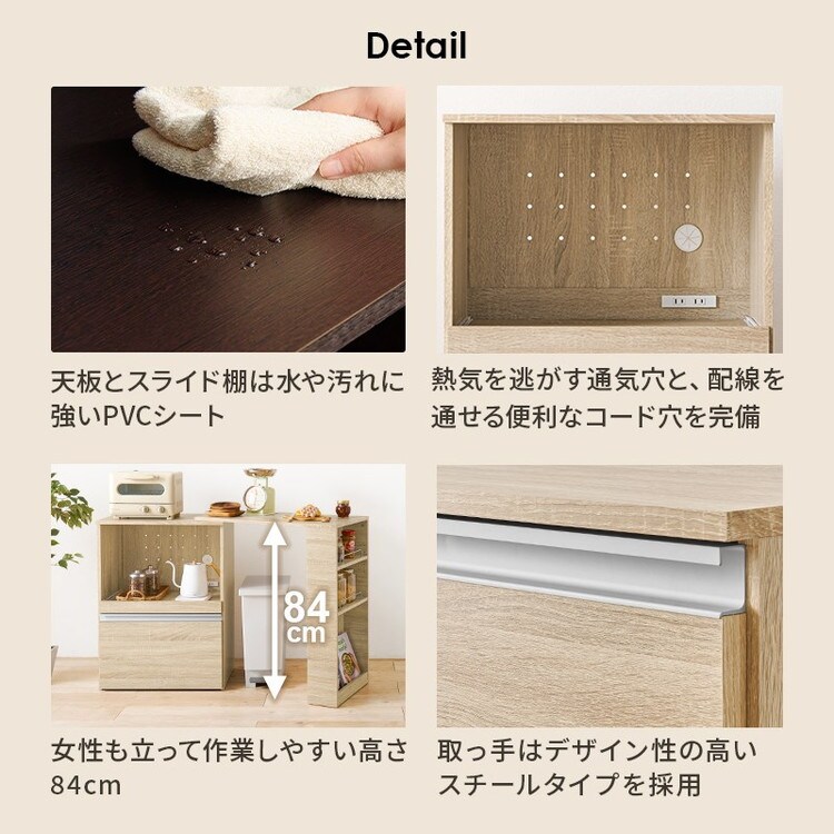 主材:プリント紙化粧パーティクルボード、天板・スライド棚:合成樹脂化粧パーティクルボード、取手:スチール
