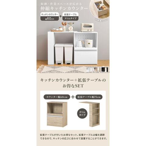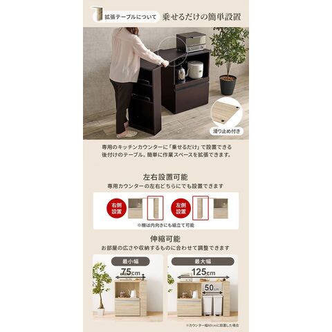 伸縮キッチンカウンター 2点セット 幅75~125 収納庫タイプ 2口コンセント 深型ドロワー スライド棚 キッチン収納 キャビネット 食器棚 レンジ台 レンジボード ごみ箱上ラック ゴミ箱上ラック おしゃれ【送料無料】