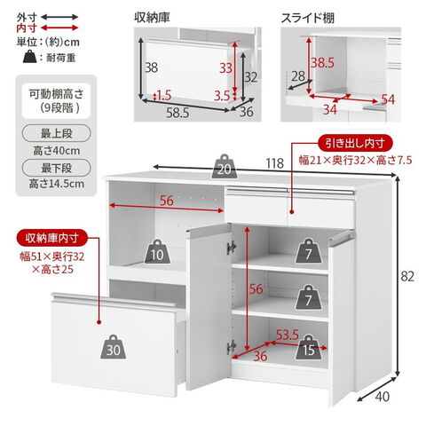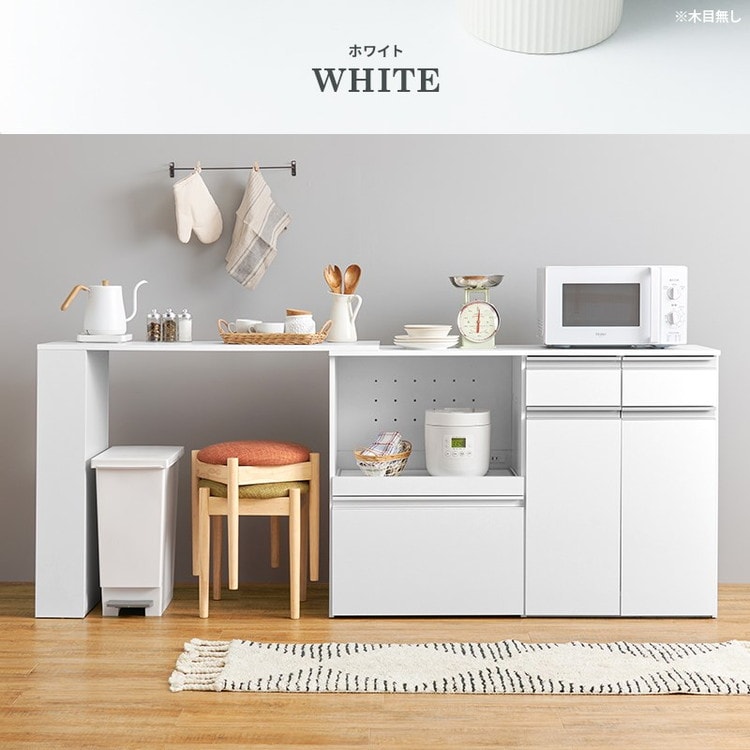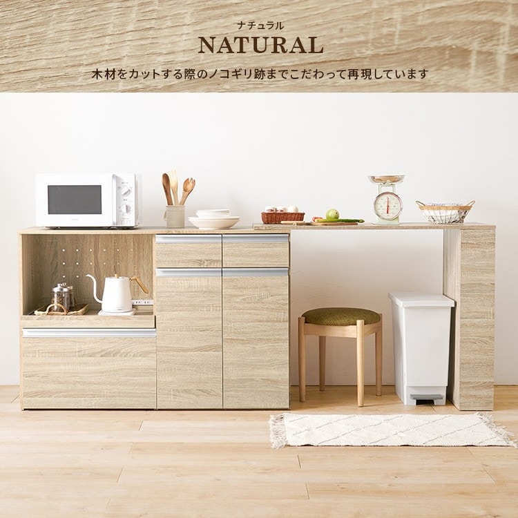 主材:プリント紙化粧パーティクルボード、天板・スライド棚:合成樹脂化粧パーティクルボード、取手:スチール