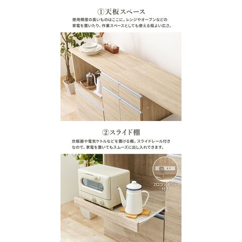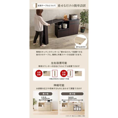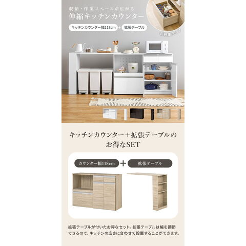 伸縮キッチンカウンター 2点セット 幅133~207 収納庫タイプ 2口コンセント 深型ドロワー スライド棚 キッチン収納 キャビネット 食器棚 レンジ台 レンジボード ごみ箱上ラック ゴミ箱上ラック【送料無料】