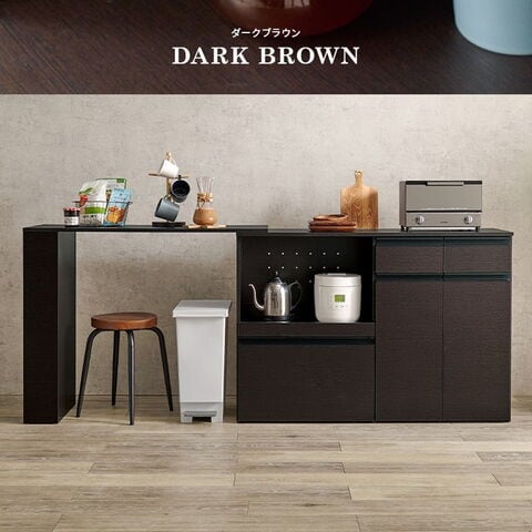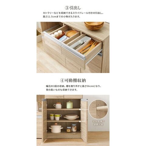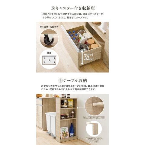 お部屋の広さや収納するものに合わせて幅を調整できるカウンターキャビネット。食器や調理器具、キッチン家電などがスッキリ片付く大容量収納。ワゴン収納庫タイプ