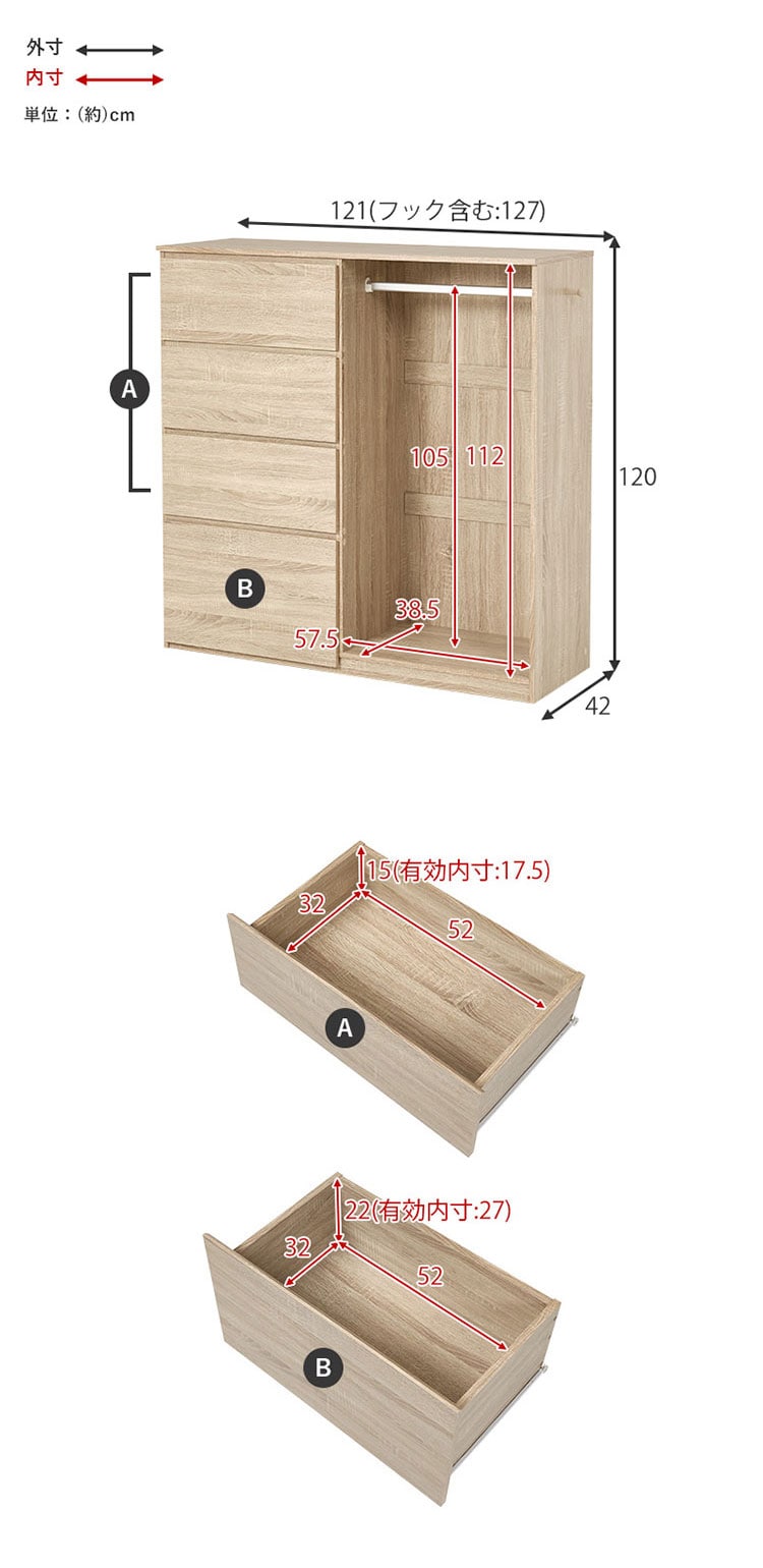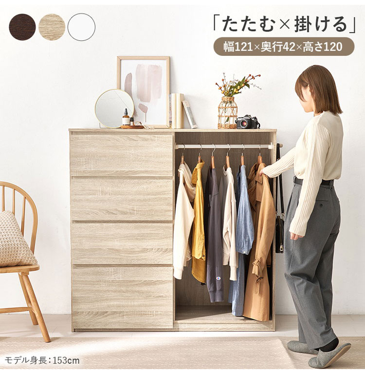 引き出し収納付き ハンガーラック 幅121cm たたむ×掛ける クローゼット ワードローブ コートハンガー タンス 箪笥 チェスト 収納 ラック おしゃれ【送料無料】