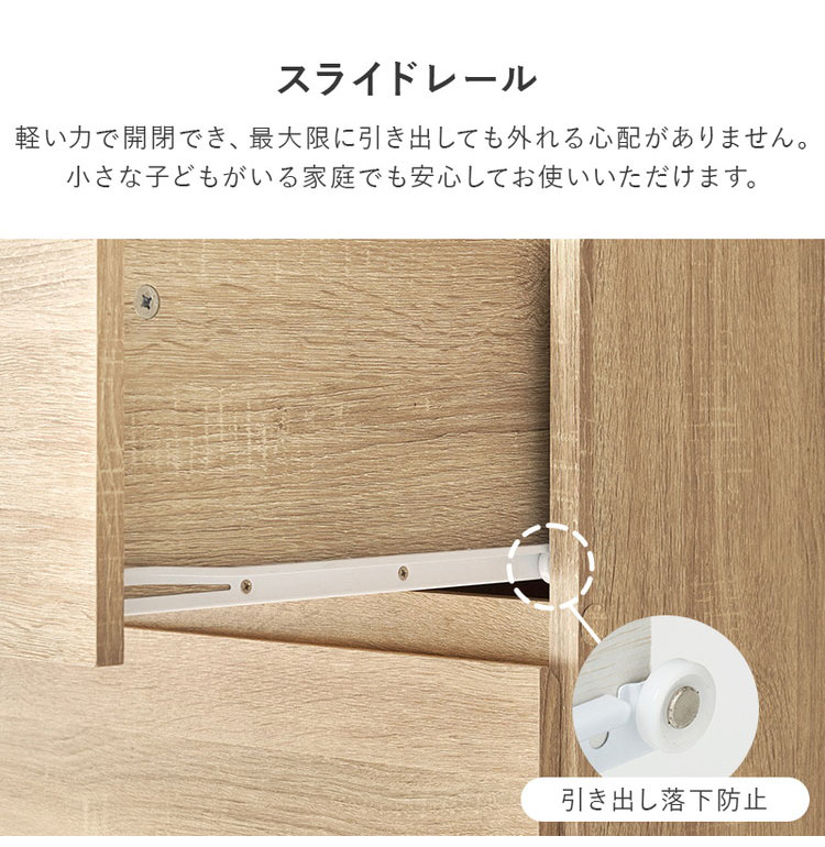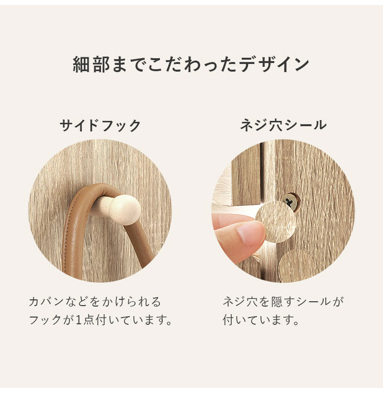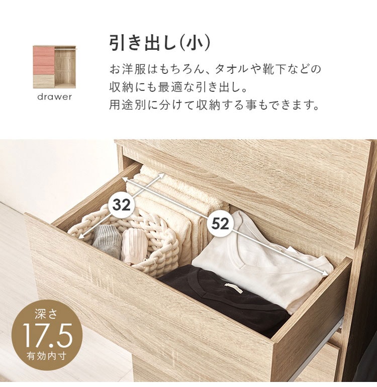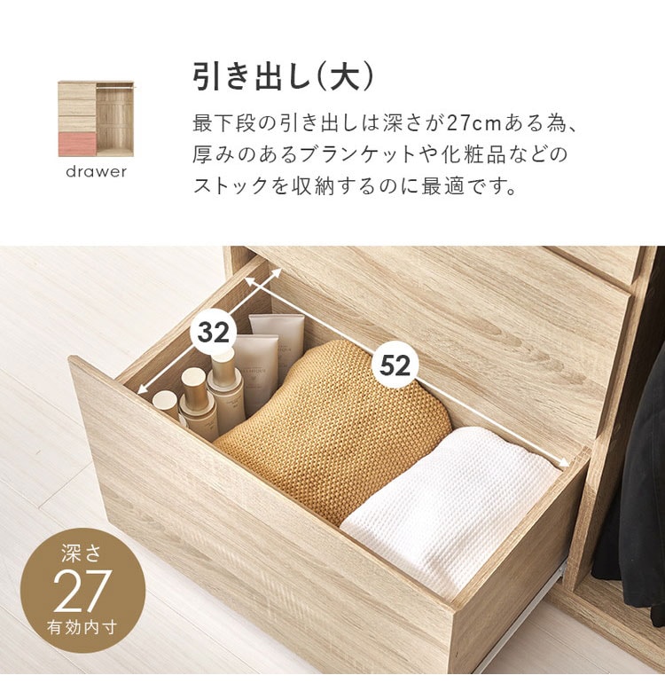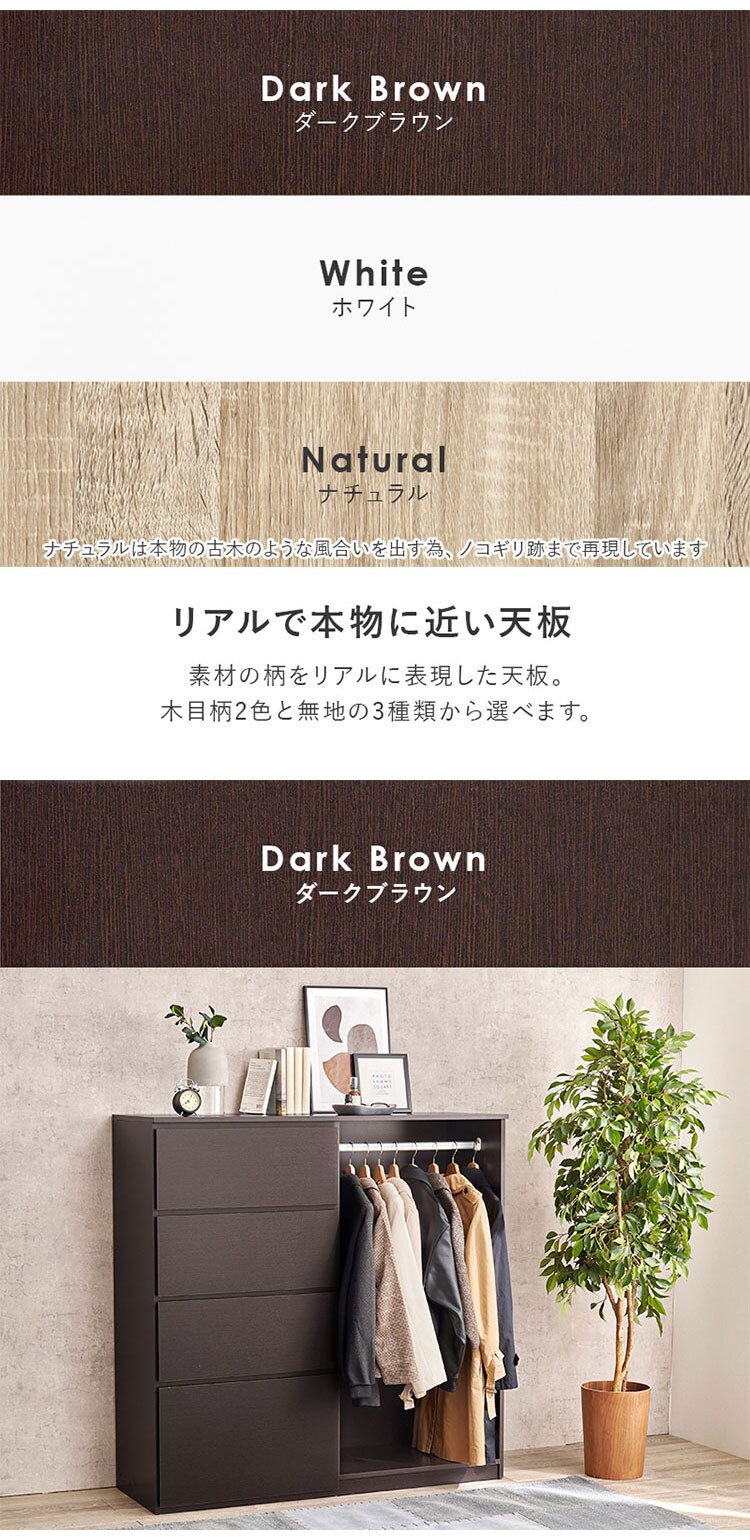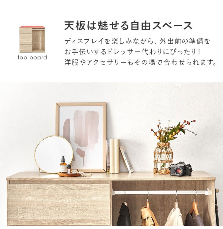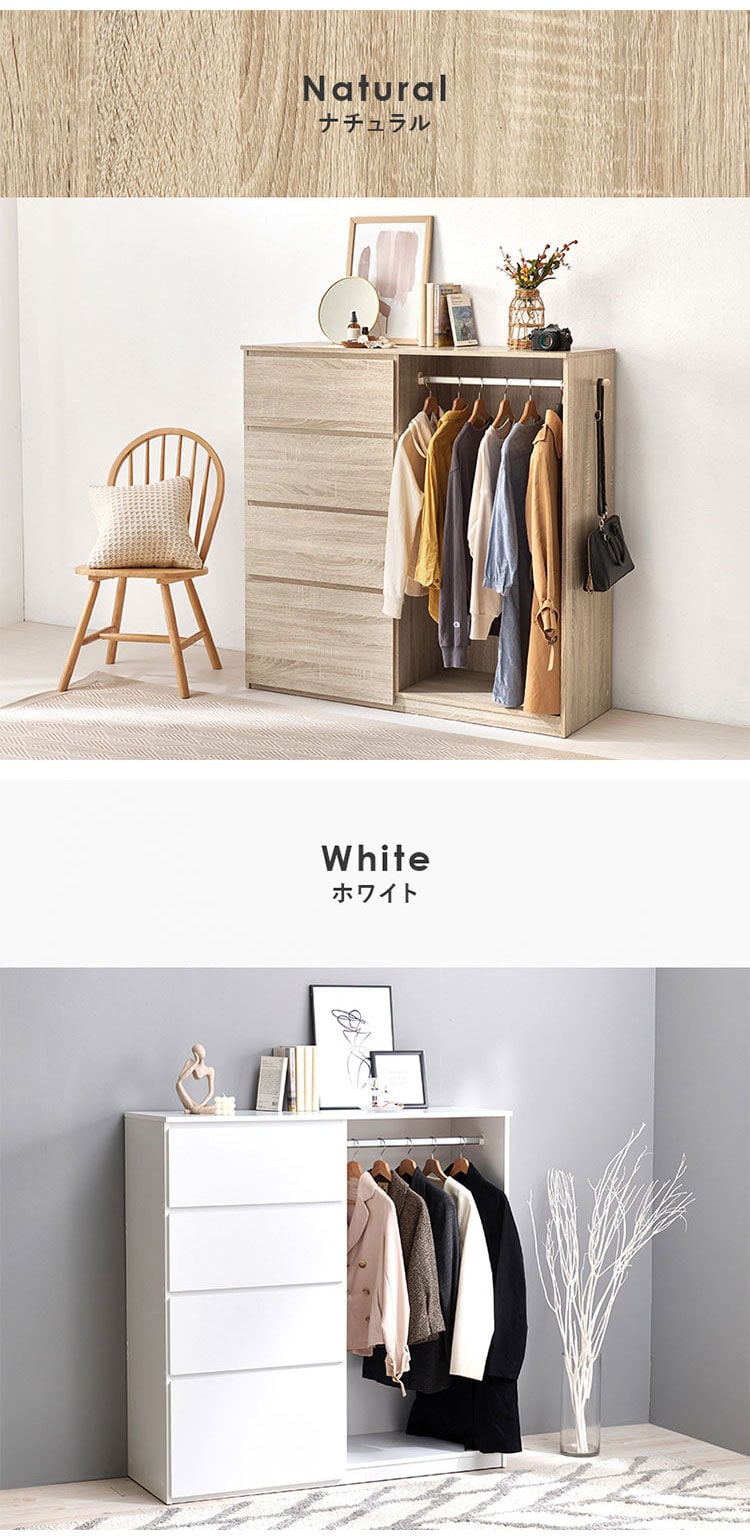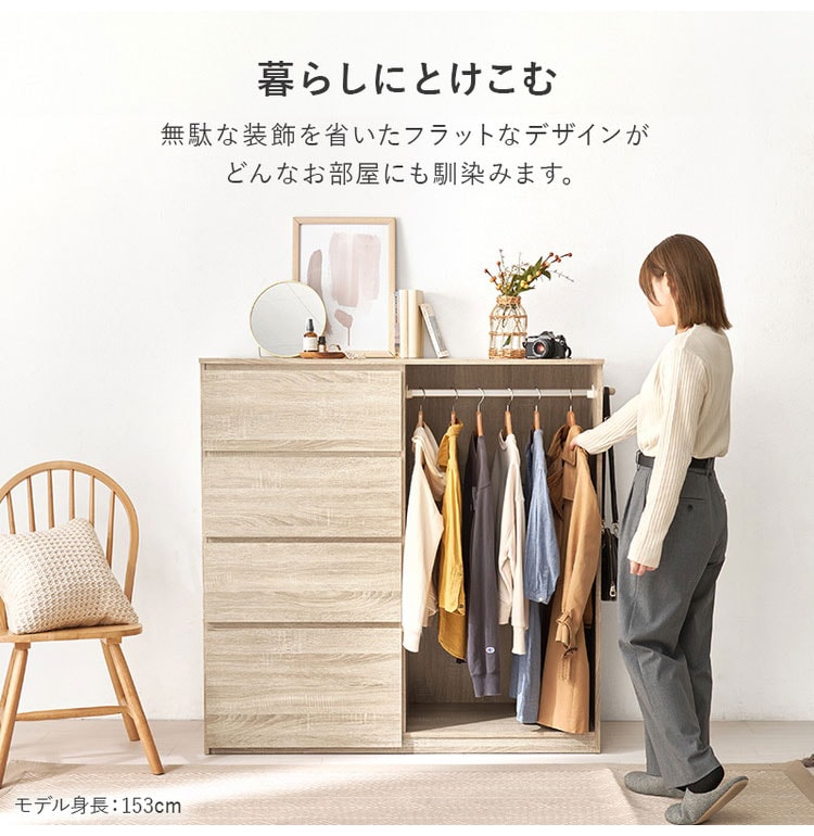 大きな引出しとハンガーポールが付いていて、これ1台で大量の服や小物をまとめて収納可能。フラットなお部屋になじむデザインです。