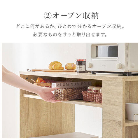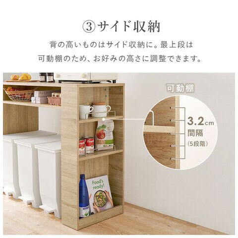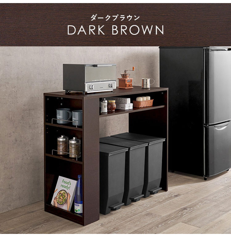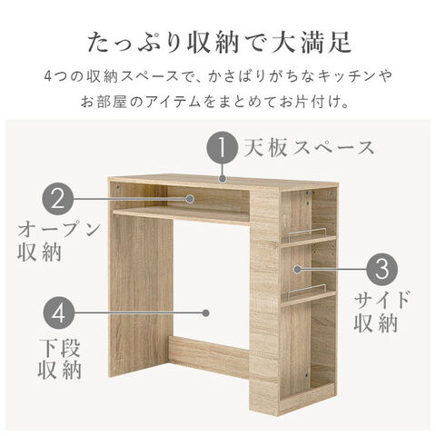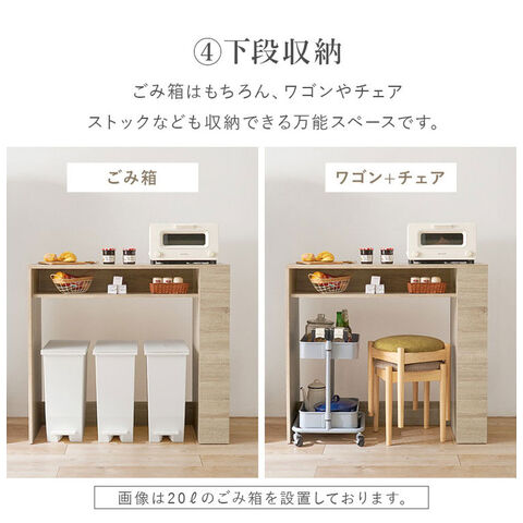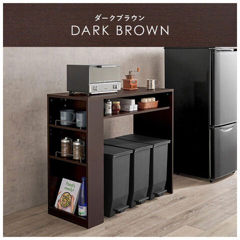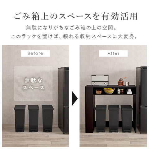 ごみ箱上のスペースを有効活用できる、シンプルデザインのラック。天板下やサイドにオープン収納が付いていてキッチン小物も収納可能。
