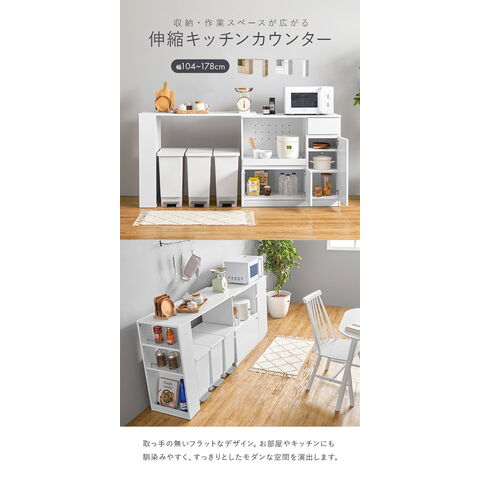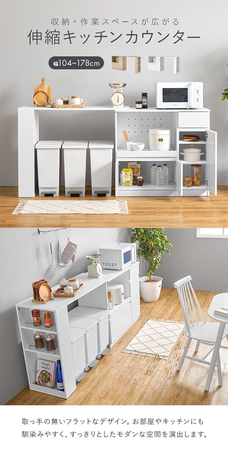 伸縮キッチンカウンター 2点セット 幅104~178 フラット 2口コンセント スライド棚 引出し 扉収納 キッチン収納 キャビネット 食器棚 レンジ台 レンジボード ごみ箱上ラック【送料無料】