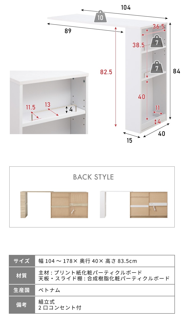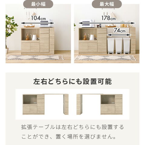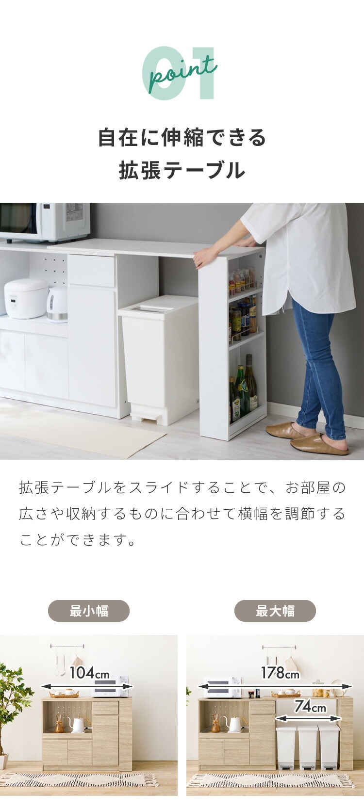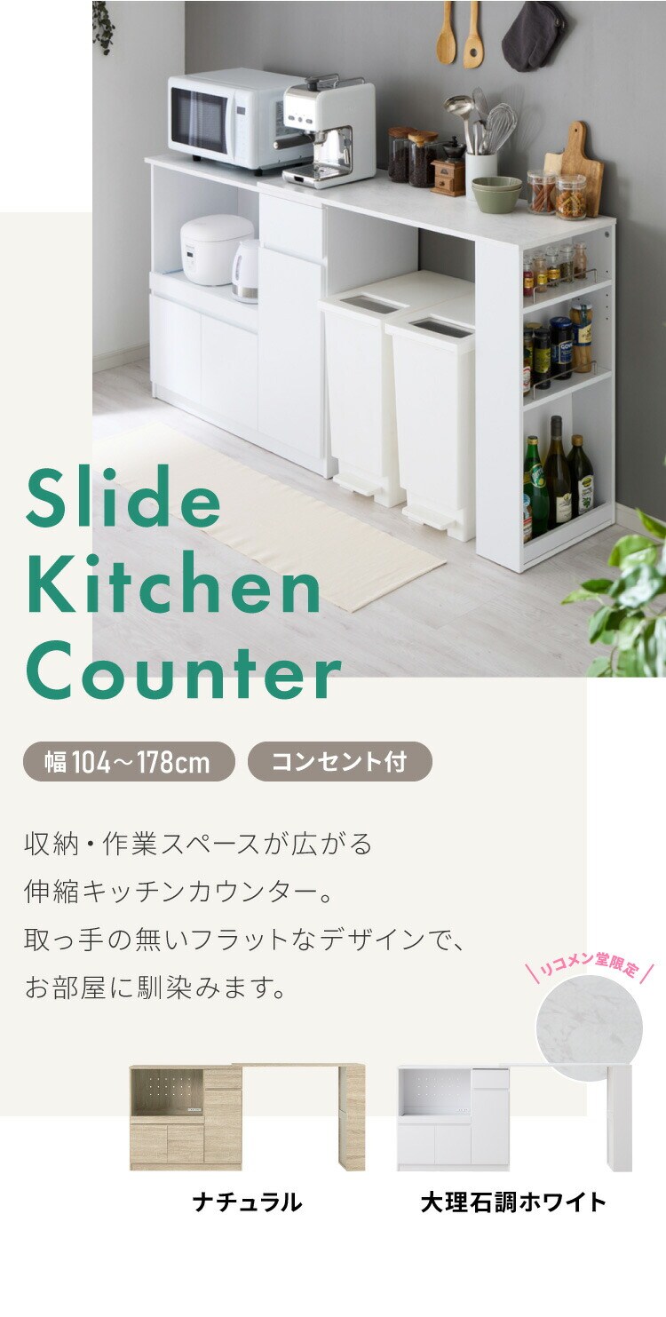 伸縮キッチンカウンター 2点セット 幅104~178 大理石調 フラット 2口コンセント スライド棚 引出し 扉収納 キッチン収納 キャビネット 食器棚 レンジ台 レンジボード ごみ箱上ラック【送料無料】