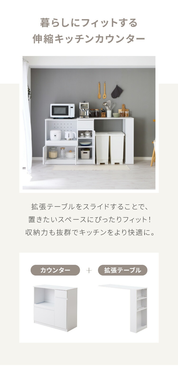 収納・作業スペースが広がる伸縮キッチンカウンター。