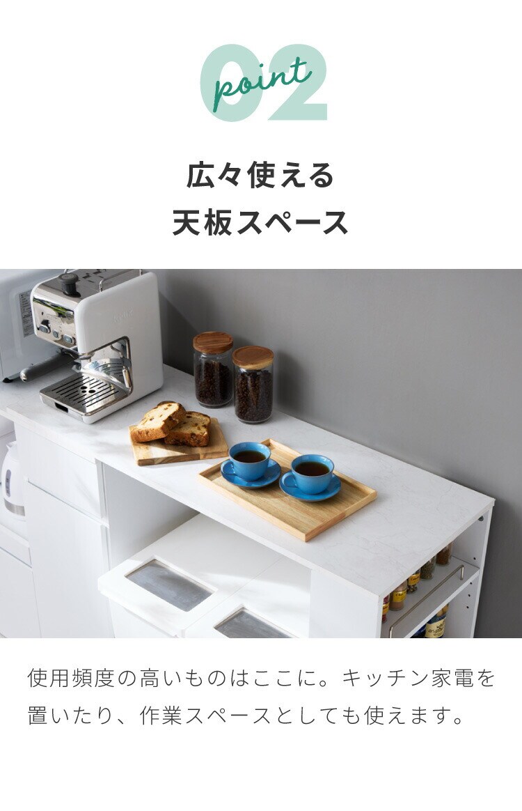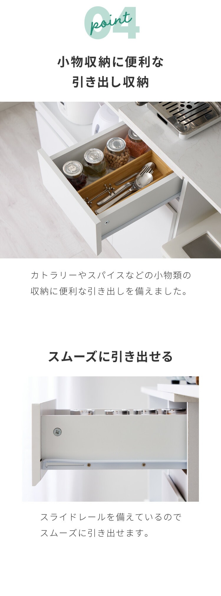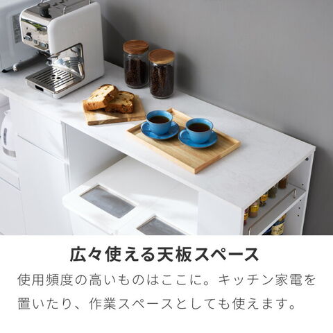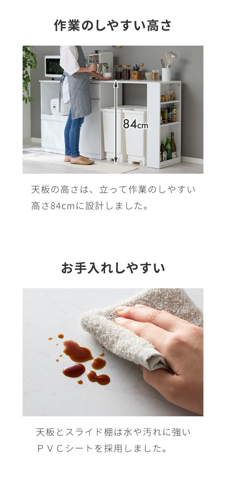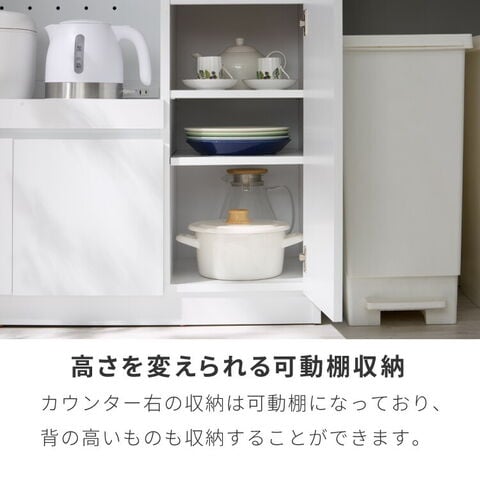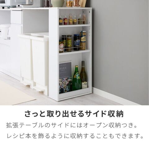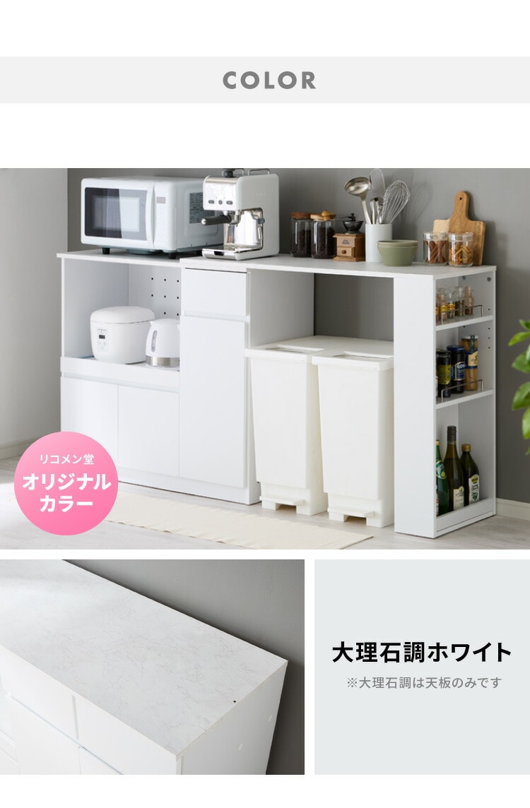 大理石調、モノトーン、白、ホワイト、キッチンカウンター、伸縮式、伸長式、食器棚、収納、ゴミ箱上ラック、ゴミ箱ラック、ごみ箱上ラック、ごみ箱ラック、キッチンラック
