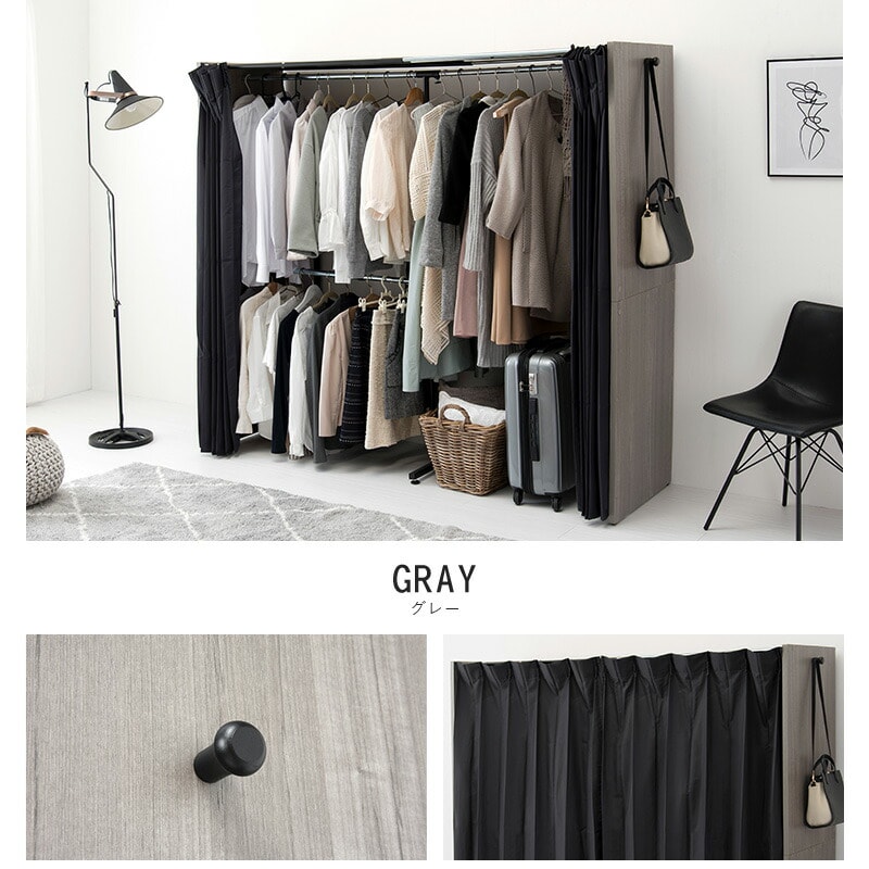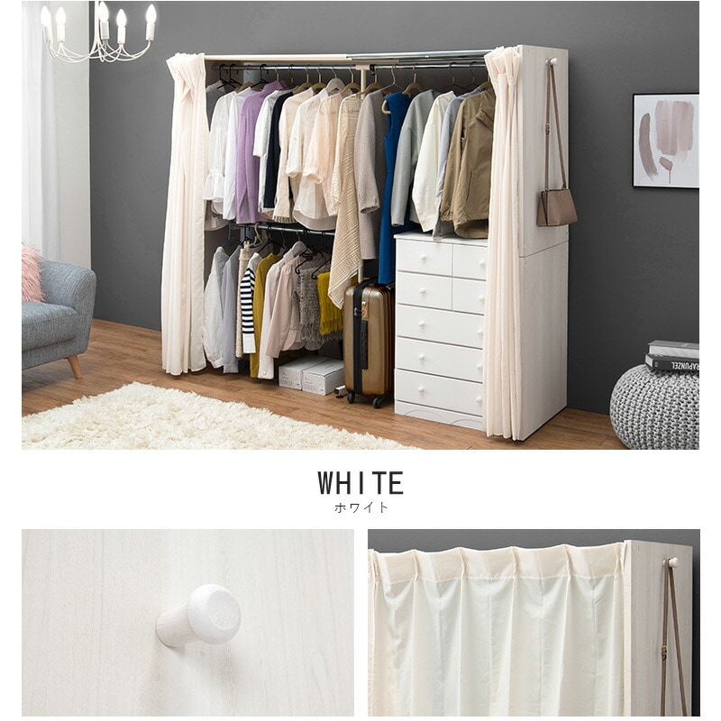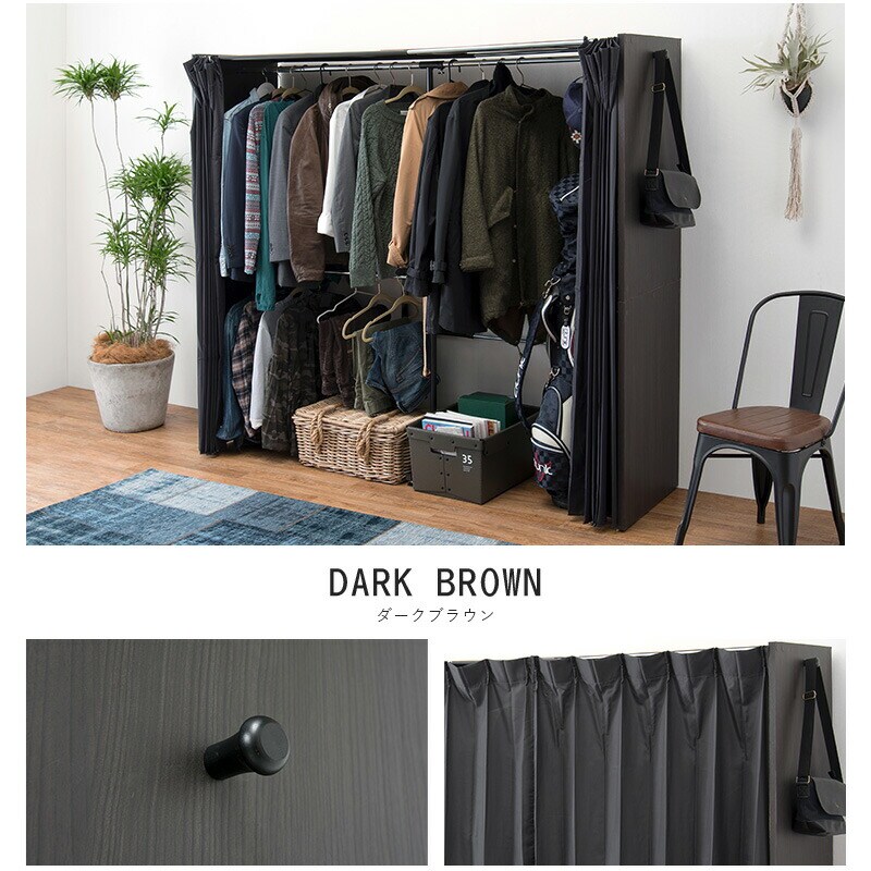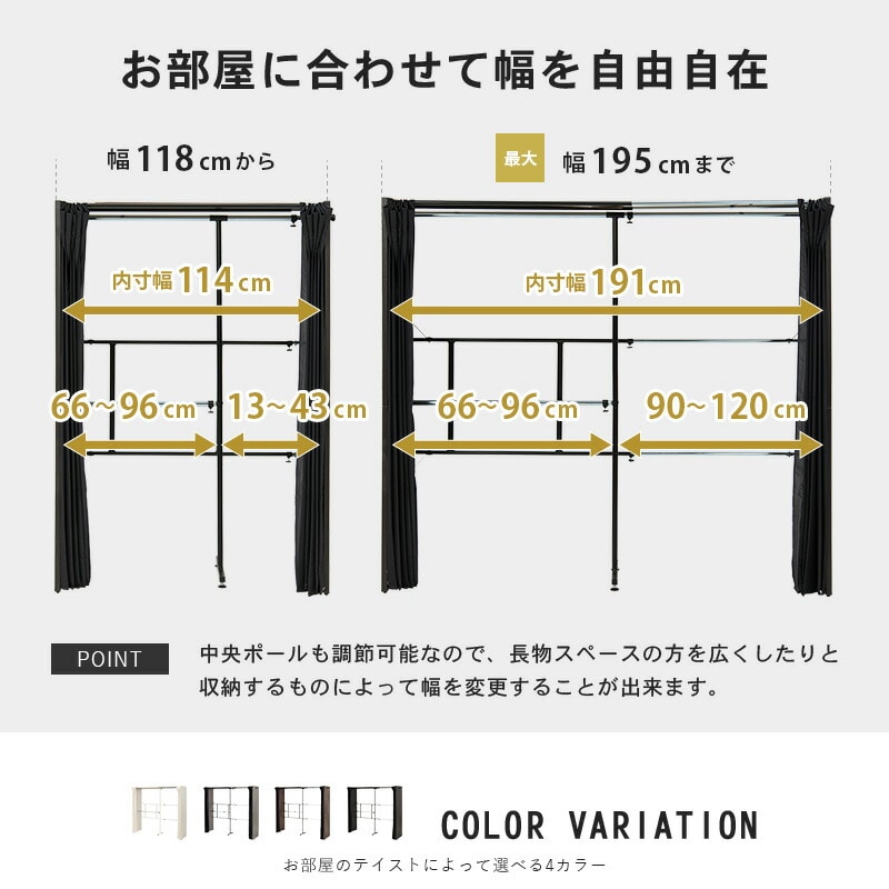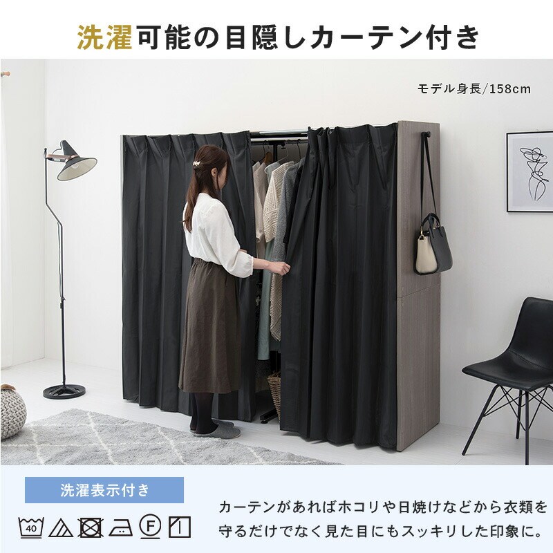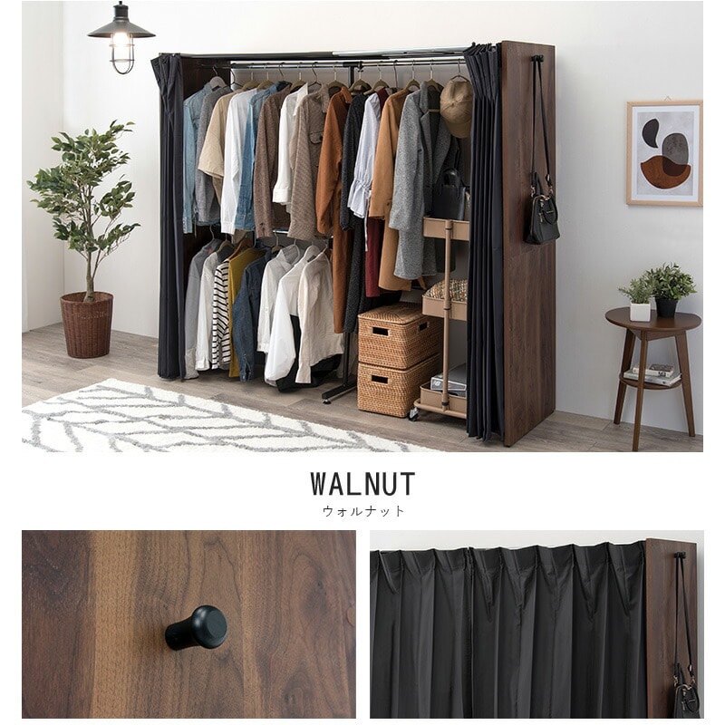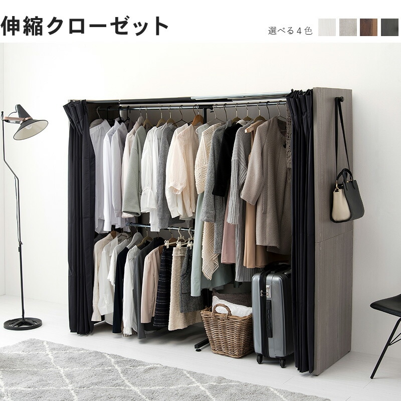 伸縮 クローゼット 幅118~195 ハンガーラック ワードローブ 大容量 省スペース 目隠しカーテン フック付 木製 コートハンガー【送料無料】