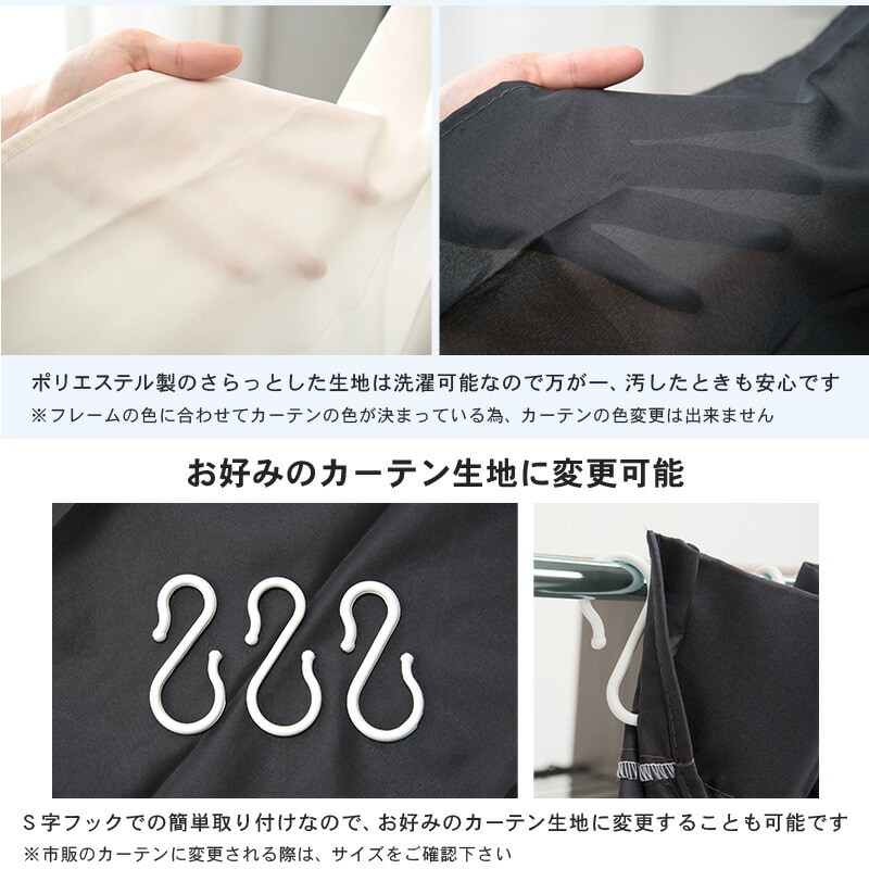 S字フックでの簡単取り付けなので、お好みのカーテン生地に変更することも可能です。