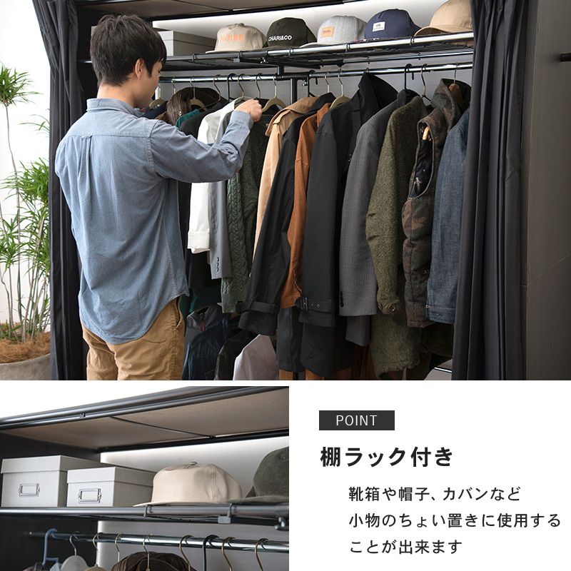 カーテン付きで目隠しできるから季節ものの服や雑貨、ゴルフバッグや衣装ケースなど服だけでなく普段使わないものをまとめて収納できます。