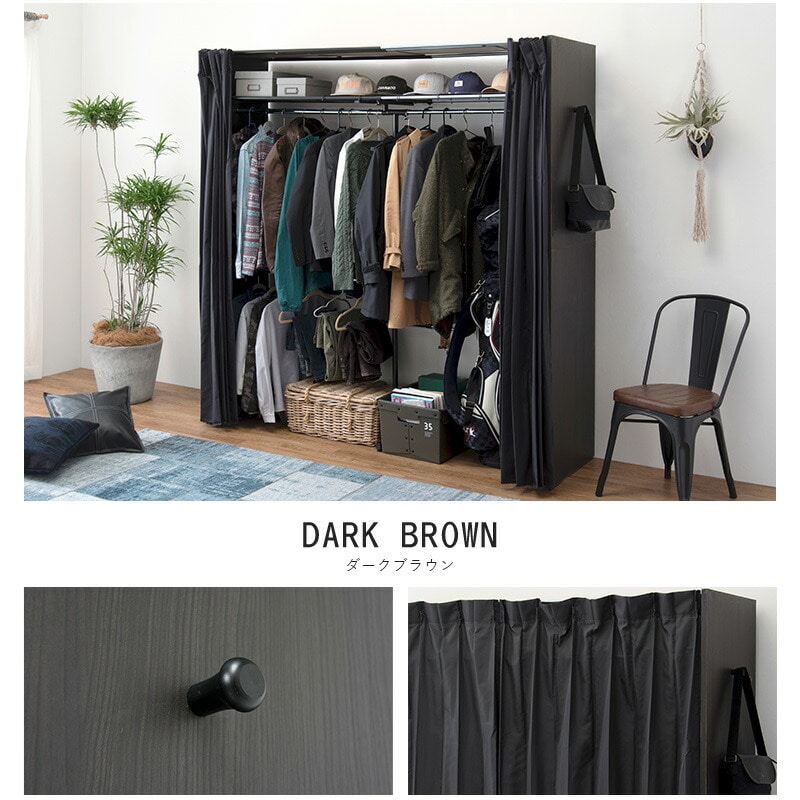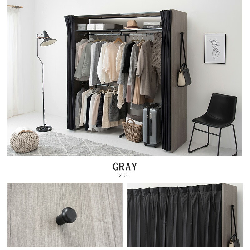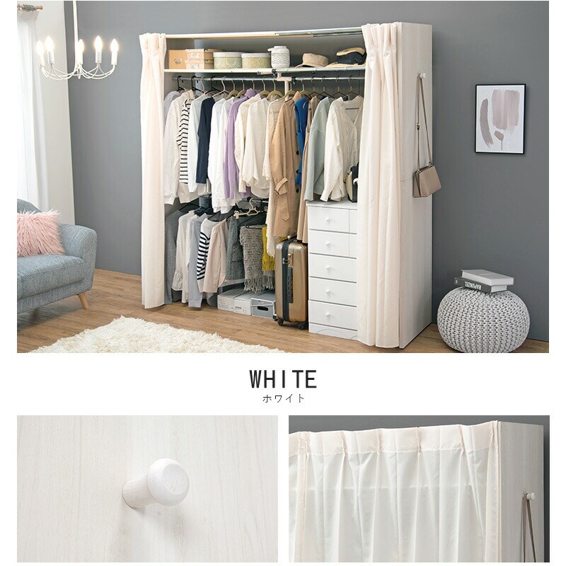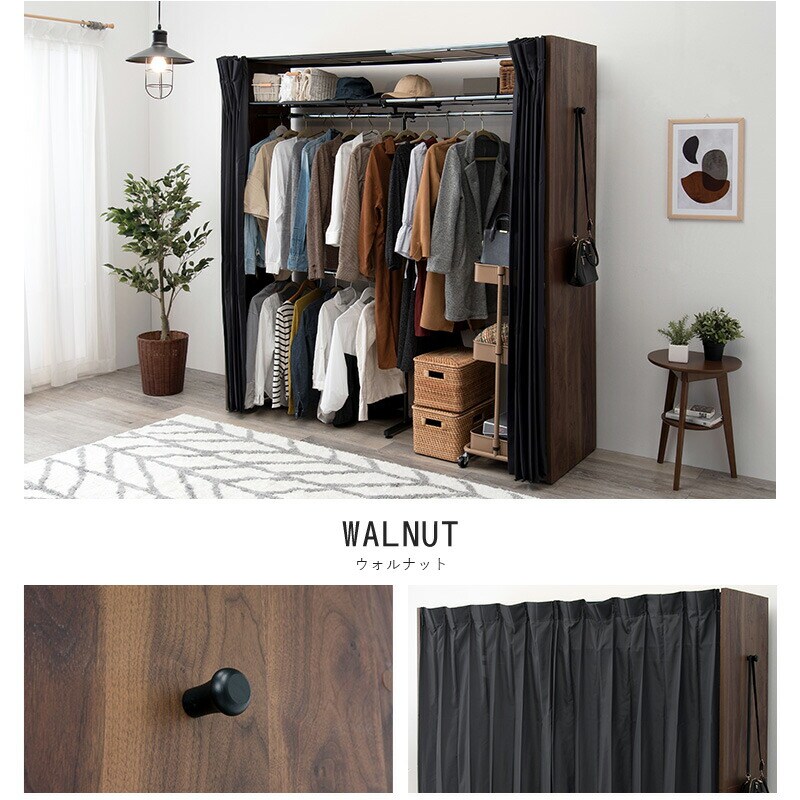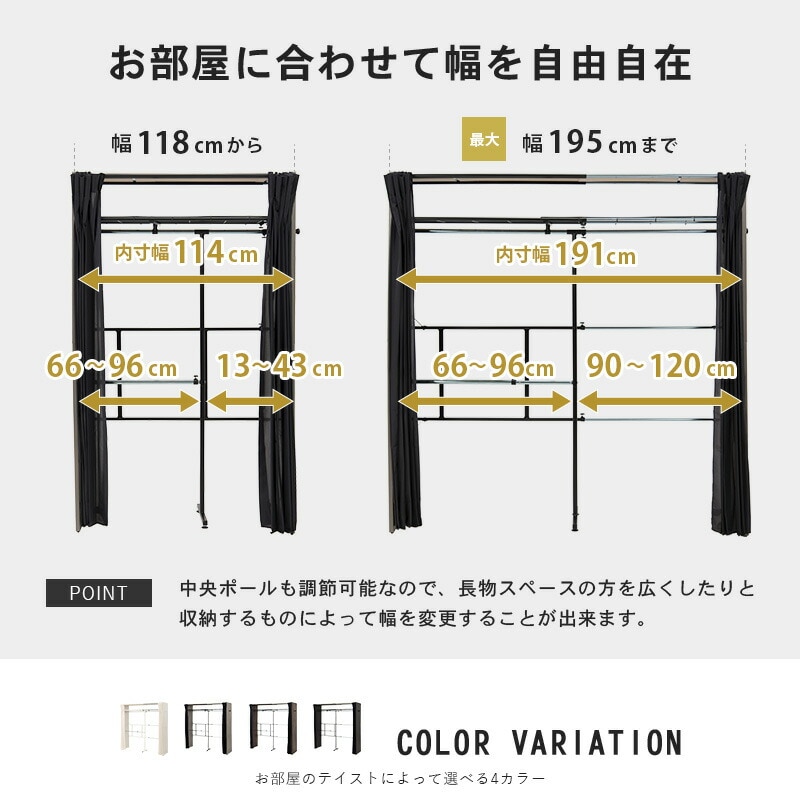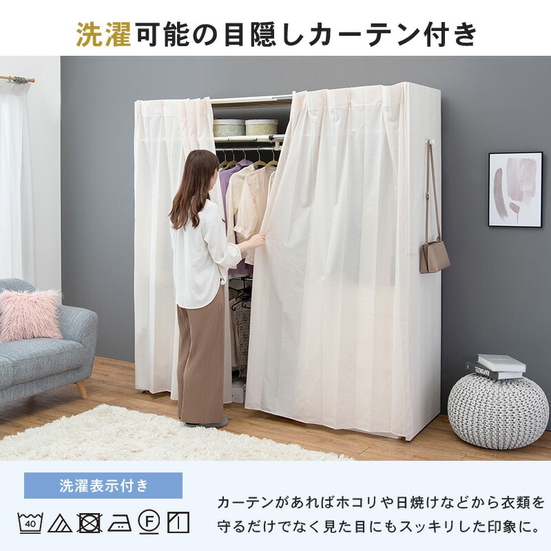 伸縮 クローゼット 棚付き 幅118~195 ハンガーラック ワードローブ 大容量 省スペース 目隠しカーテン フック付 木製【送料無料】