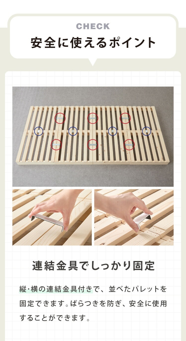 タテヨコ連結用の金具付きで、パレットのばらつきを防止します。
