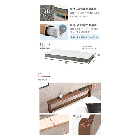 ベッド:(約)幅99×奥行207×高さ64×床面高32cm,マットレス:(約)幅97×奥行195×高さ14.5cm