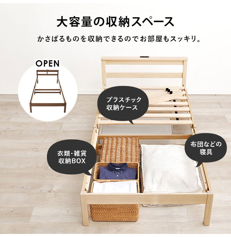 工具不要・簡単組立 すのこベッド シングル ポケットコイルマットレス付き 耐荷重150kg 2口コンセント付き ベッドフレーム 木製 スノコ ベッド【送料無料】