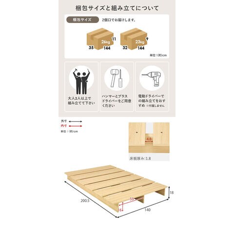 ベッド:(約)幅140×奥行200.5×高さ18cm、マットレス:(約)幅120×奥行195×高さ14.5cm