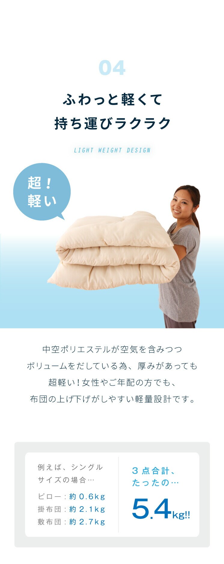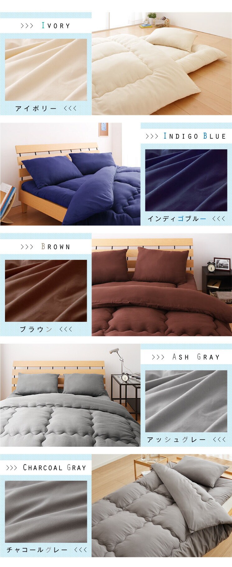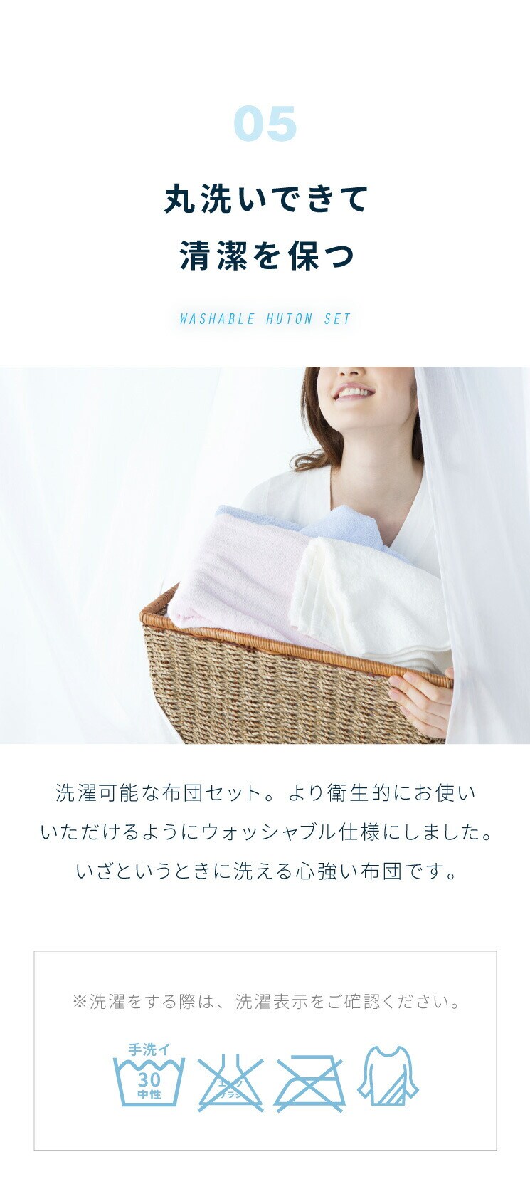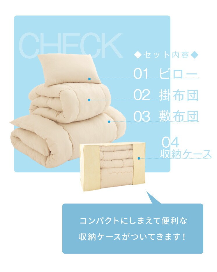 ・家庭で丸洗い可能。お手入れがしやすく長く清潔に使える布団セットです