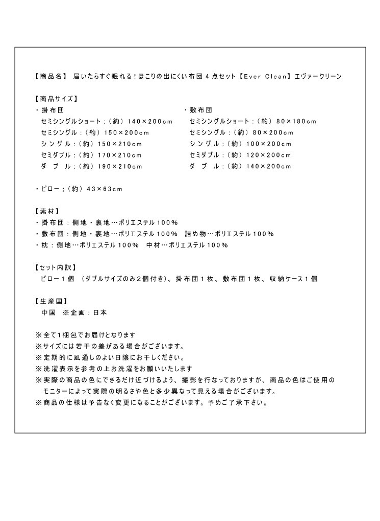 布団4点セット セミシングル【Ever Clean】エヴァークリーン ほこりが出にくい 中空ポリエステル綿 洗える ピーチスキン加工 軽量 おしゃれ ふとんセット 掛布団 掛け布団 敷布団 敷き布団 枕【送料無料】のレビュー
