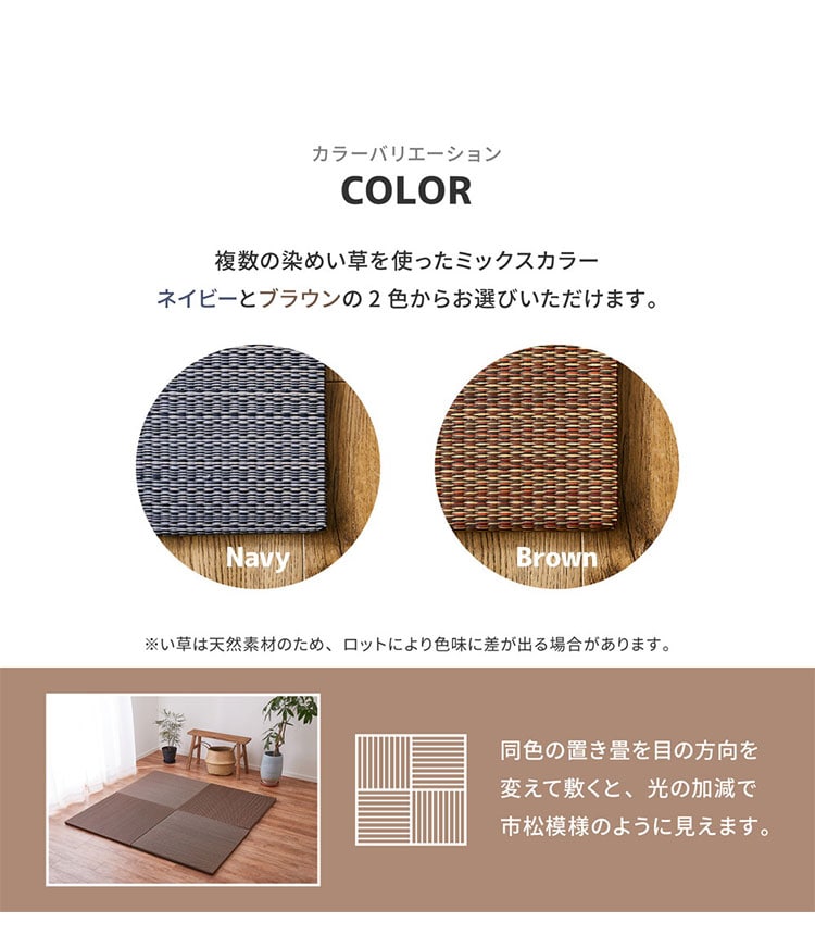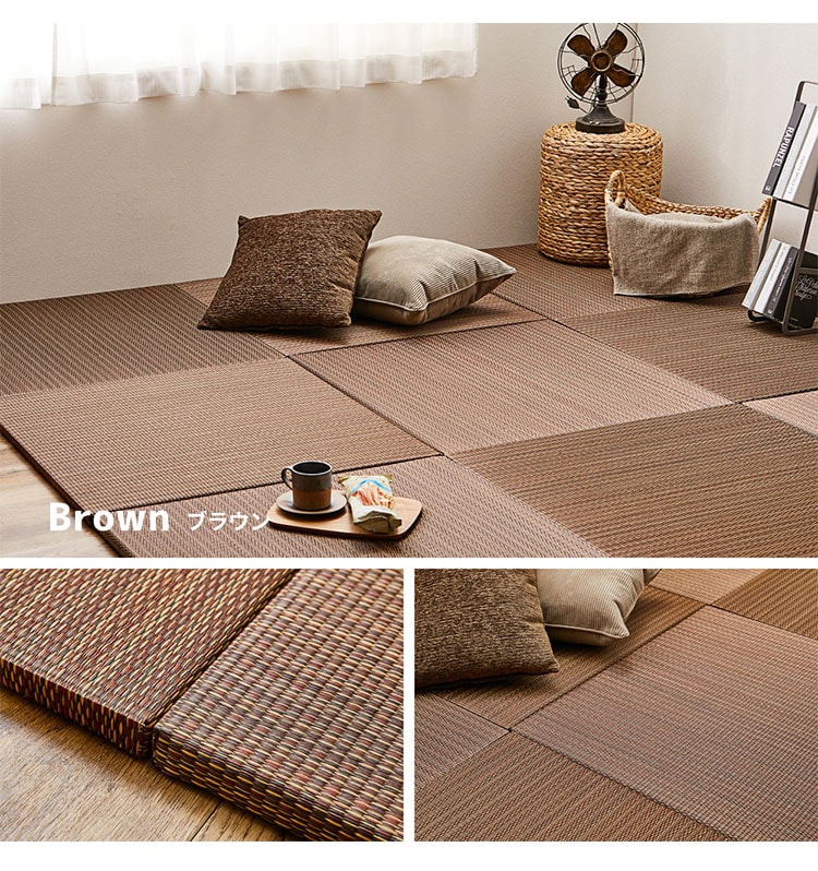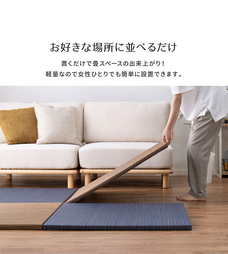 床に並べるだけで簡単に畳のスペ-スが作れる「置き畳」です。軽量なので女性1人でも取り扱いがラクラク。ちょっとした隙間スペ-スを有効活用できるのでキッズ向けのプレイマットからシニアのお昼寝、お父さんお母さんのごろ寝スペ-スまで簡単に作れます。適度なくション性があり、階下への配慮や床のキズ防止など、子育て中にもうれしい便利グッズ。天然い草を使用し、等間隔な織り方でサラッとなめらかな手触り。い草の空気清浄や湿度調整機能で年中快適です。