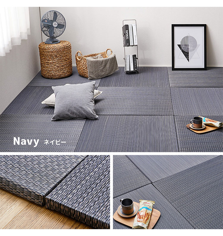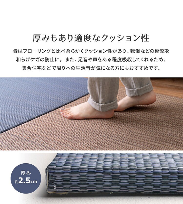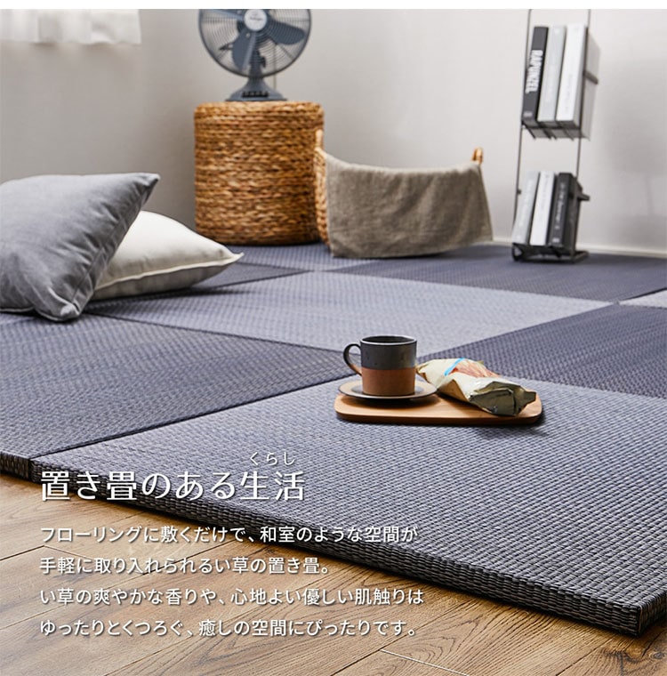 床に並べるだけで簡単に畳のスペ-スが作れる「置き畳」です。軽量なので女性1人でも取り扱いがラクラク。ちょっとした隙間スペ-スを有効活用できるのでキッズ向けのプレイマットからシニアのお昼寝、お父さんお母さんのごろ寝スペ-スまで簡単に作れます。適度なくション性があり、階下への配慮や床のキズ防止など、子育て中にもうれしい便利グッズ。天然い草を使用し、等間隔な織り方でサラッとなめらかな手触り。い草の空気清浄や湿度調整機能で年中快適です。