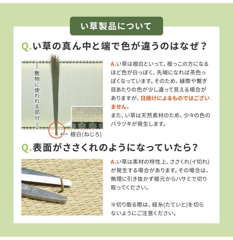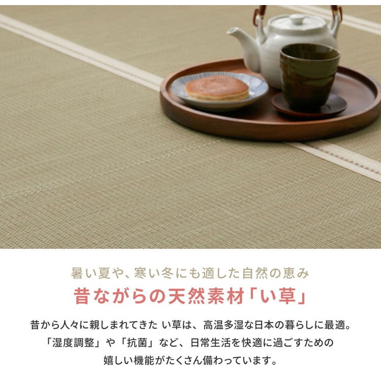 急な来客など必要な時にサッと取り出せ、パッと広げるだけ。折りたたんでコンパクトに収納できるので、出し入れも簡単!マットレスとしてフローリングと敷布団の間に敷けば、程よいクッション性で床の硬さを軽減。い草の快適機能で、床と布団のジメジメや底冷えのひやっと感からも守ってくれます。また、置き畳のようにもお使いいただけるため、複数枚を並べて敷けば、広々とした畳スペースに。
