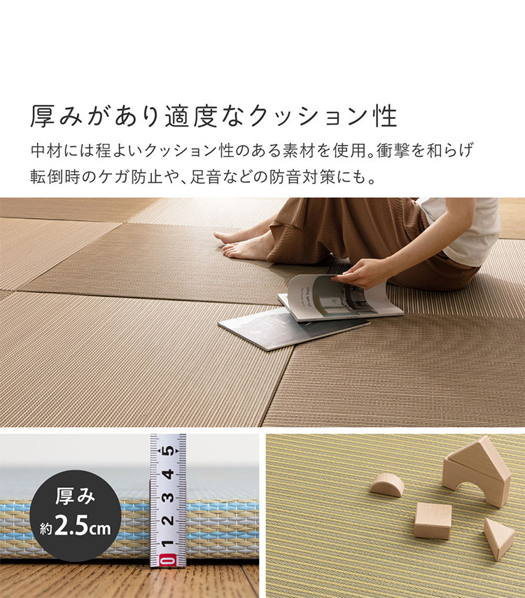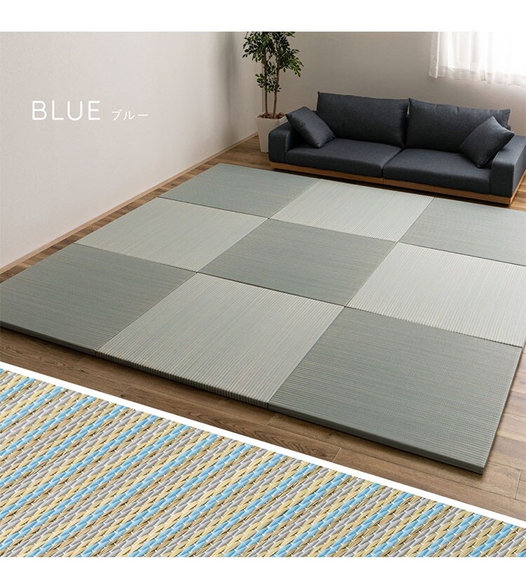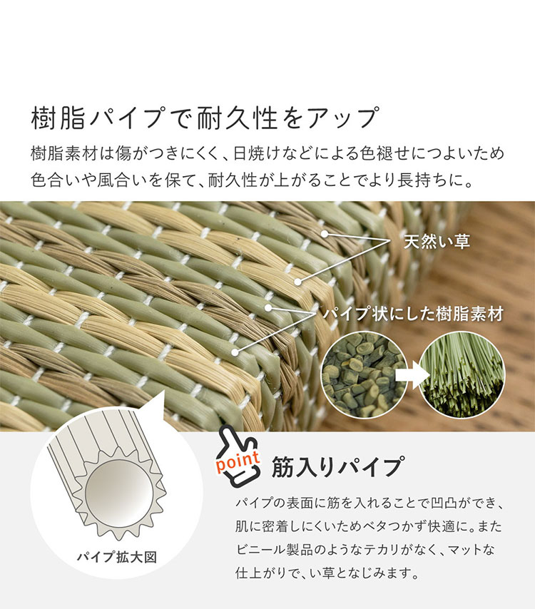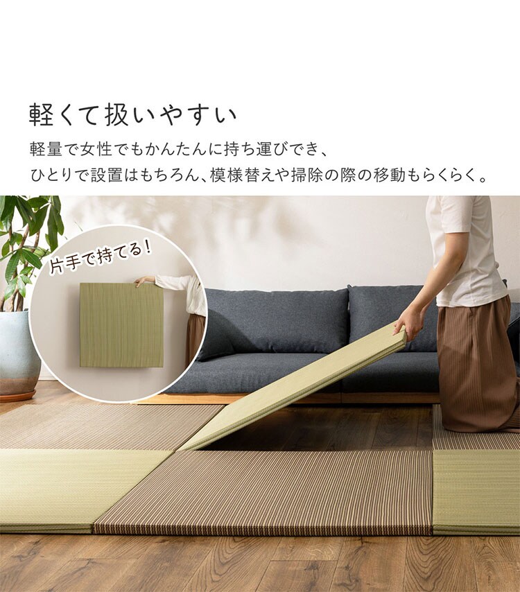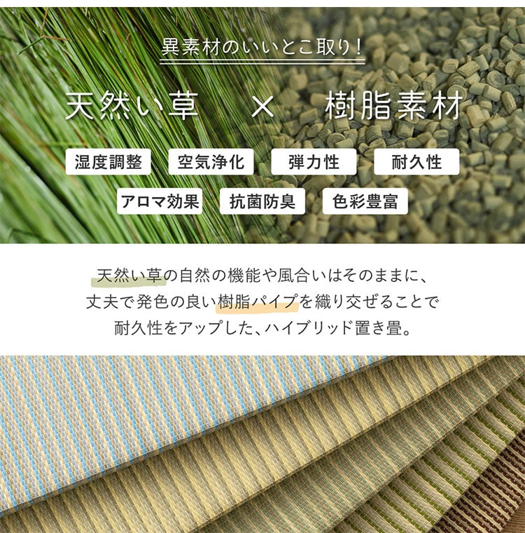 天然い草×樹脂素材。調湿効果や抗菌性など、天然い草の自然の機能や風合いはそのままに、丈夫な樹脂パイプを織り交ぜることで耐久性をアップ!異なる素材のいい性質を残したハイブリッド置き畳。樹脂パイプは傷つきにくく、日焼けなどによる色褪せにつよいため色合いや風合いを長く保ち、耐久性が上がることでより長くお使いいただけます。場所や広さはお好みで、置くだけでかんたんに畳スペースがつくれる置き畳は、ちょっとした隙間スペースを有効活用できるので、キッズ向けのプレイマットからシニアのお昼寝、お父さんお母さんのごろ寝スペースまで使い方はいろいろ。軽量だから設置はもちろん、掃除やなどの移動もらくらく。適度なクッション性があり、階下への配慮や床のキズ防止など、子育て中にもうれしい便利グッズ。