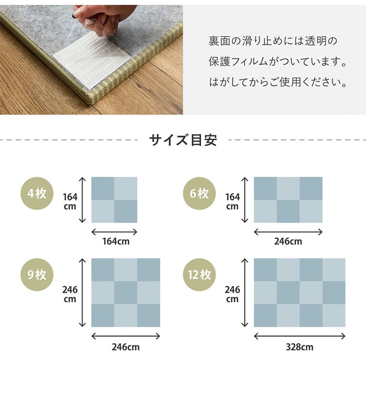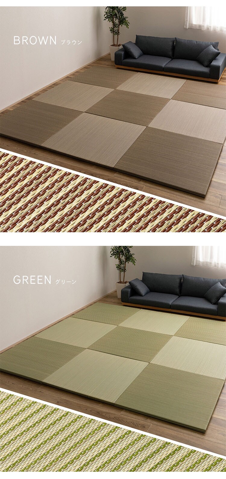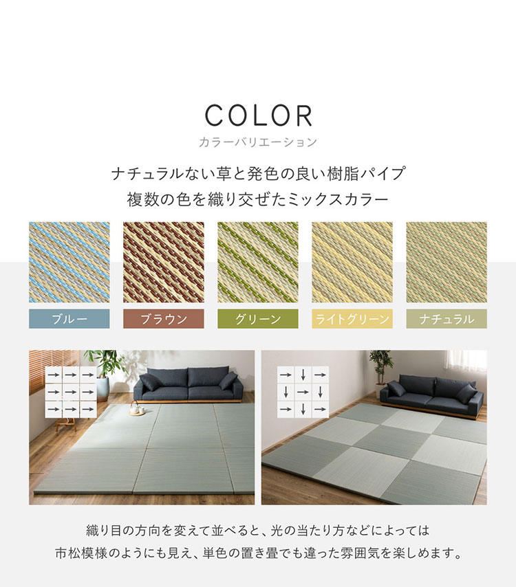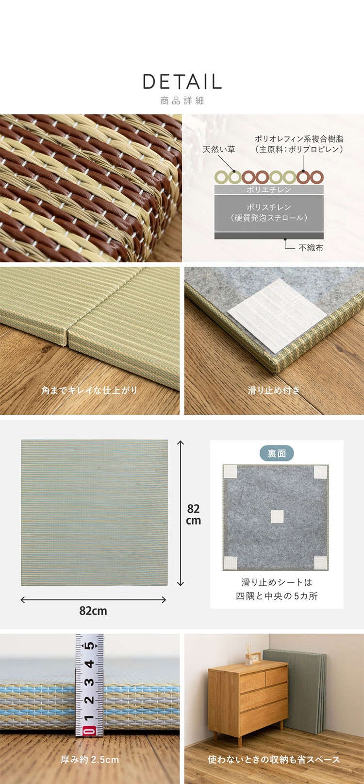天然い草×樹脂素材。調湿効果や抗菌性など、天然い草の自然の機能や風合いはそのままに、丈夫な樹脂パイプを織り交ぜることで耐久性をアップ!異なる素材のいい性質を残したハイブリッド置き畳。樹脂パイプは傷つきにくく、日焼けなどによる色褪せにつよいため色合いや風合いを長く保ち、耐久性が上がることでより長くお使いいただけます。場所や広さはお好みで、置くだけでかんたんに畳スペースがつくれる置き畳は、ちょっとした隙間スペースを有効活用できるので、キッズ向けのプレイマットからシニアのお昼寝、お父さんお母さんのごろ寝スペースまで使い方はいろいろ。軽量だから設置はもちろん、掃除やなどの移動もらくらく。適度なクッション性があり、階下への配慮や床のキズ防止など、子育て中にもうれしい便利グッズ。