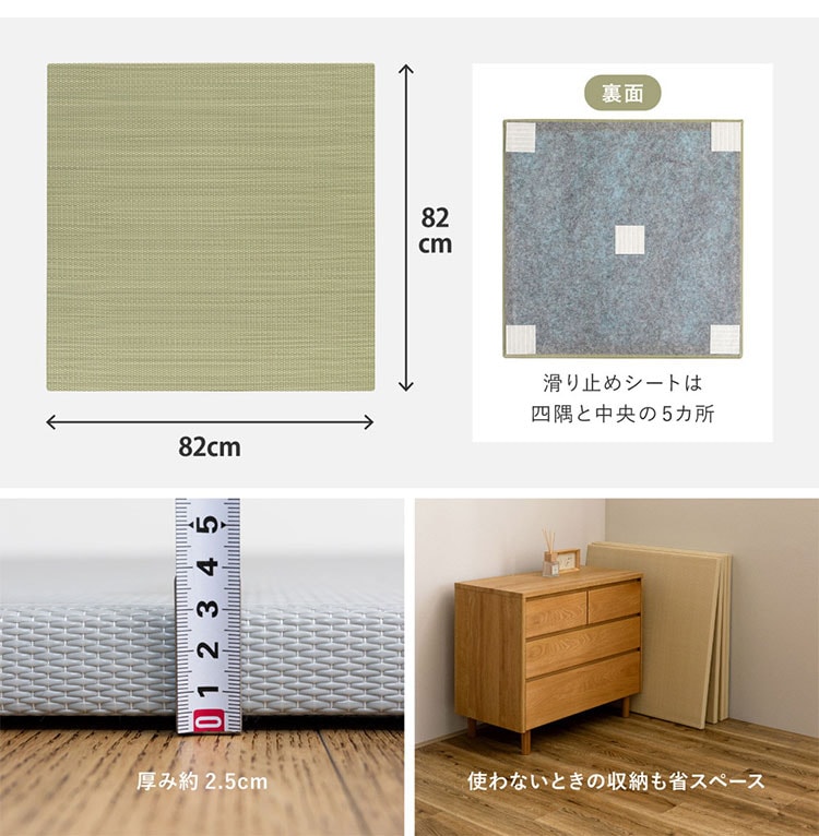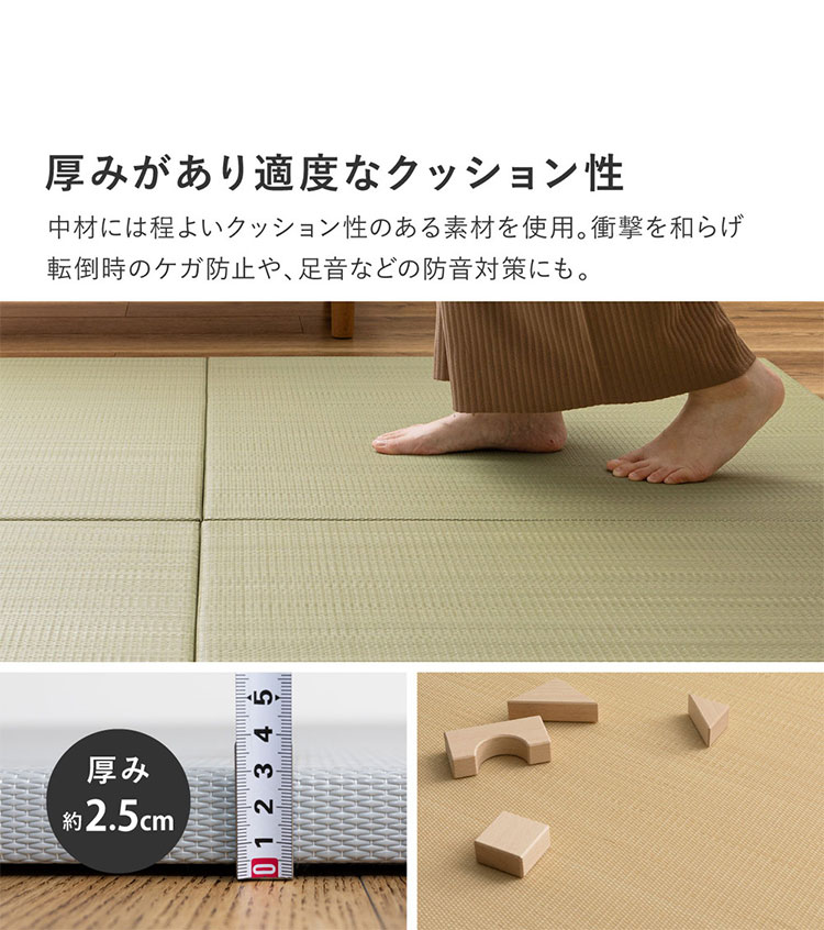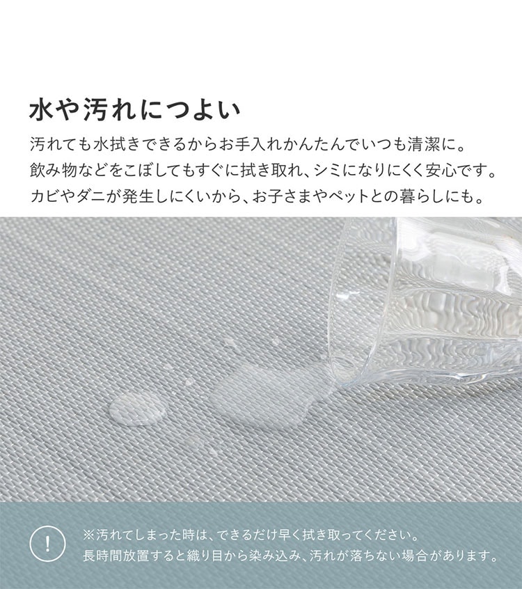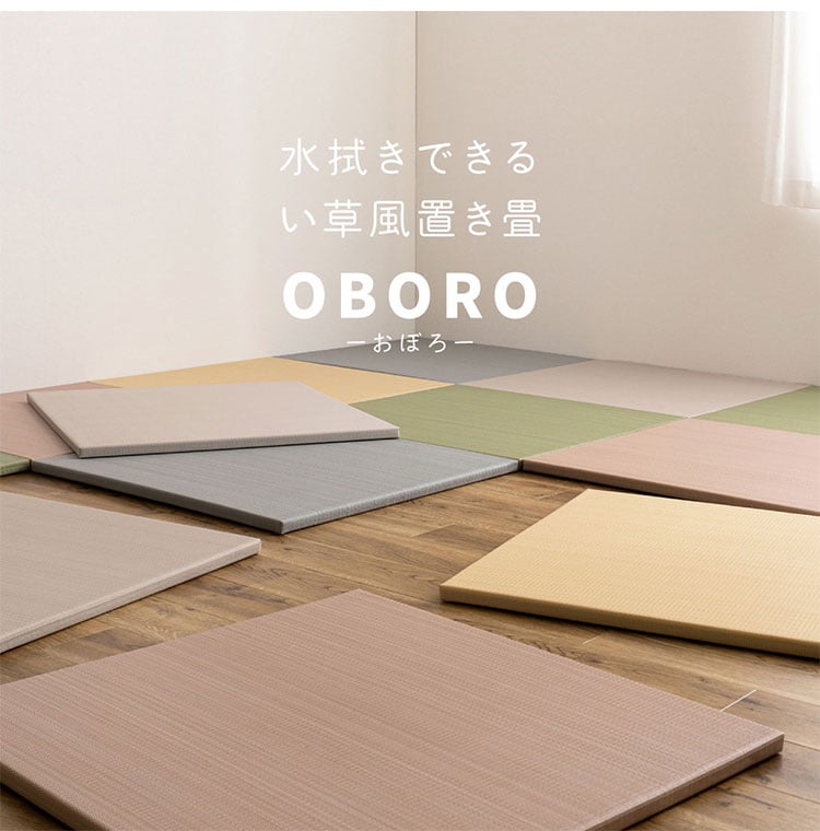 パイプ状にした樹脂素材を、い草と同じように織り上げた『い草風』の置き畳。水に強く、ジュースなどをこぼしてもさっと拭き取れるから汚れても安心。子どもやペットのいるご家庭におすすめです。ちょっとした隙間スペースを有効活用できるのでキッズ向けのプレイマットからシニアのお昼寝、お父さんお母さんのごろ寝スペースまで使い方はいろいろ。置くだけでかんたんに畳スペースが作れます。軽量だから設置はもちろん、掃除やなどの移動もらくらく。適度なクッション性があり、階下への配慮や床のキズ防止など、子育て中にもうれしい便利グッズ。淡くやさしいパステルカラーで、お部屋の雰囲気にあわせて5色からお選びいただけます。