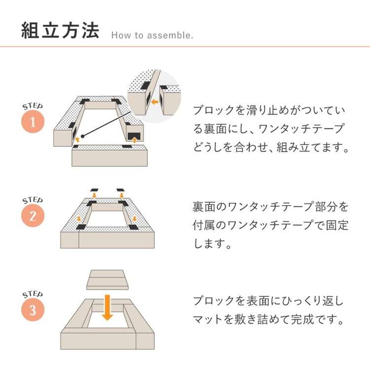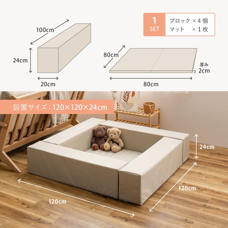 はっ水加工でお手入れしやすく、各パーツの裏面は滑り止め付きでズレにくいのもうれしいポイント。ブロック4とマット1枚がセットになっており、軽量で組み立ても簡単!届いてすぐにおしゃれなキッズスペースがつくれます。