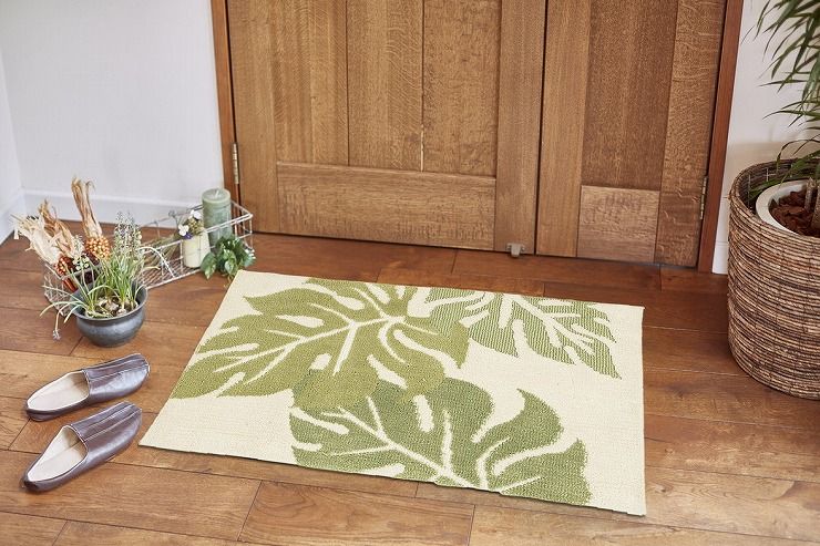 人気のモンステラ柄の玄関マットです。短めのループと短めのもこっとしたカットパイルで毛足の長さに変化をつけました。オールシーズンお使いいただける手触りです。裏面は、滑りにくい加工付き。 サイズ:約45×75cm カラー:G 組成:表面:ポリエステル100% 裏面:綿布貼り(滑りにくい加工) 原産国:中国製