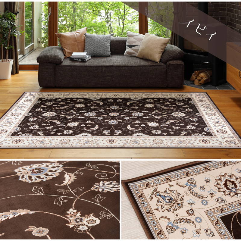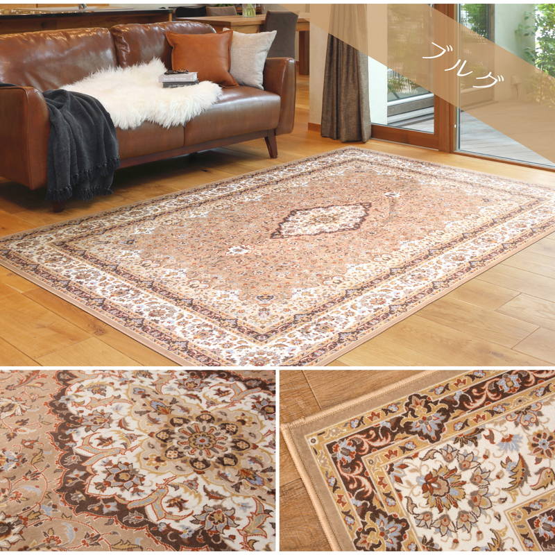 表生地は撥水加工を施したなめらかな生地でオールシーズン使える。高級絨毯風デザインを転写プリントで表現。裏面はすべり止め付きでずれにくくなっている。