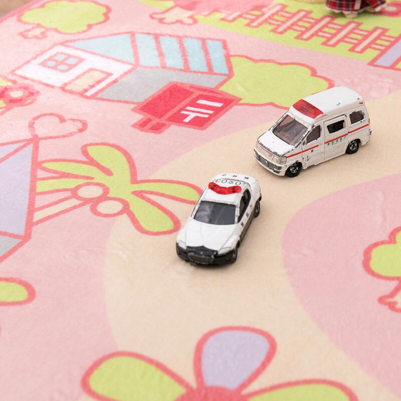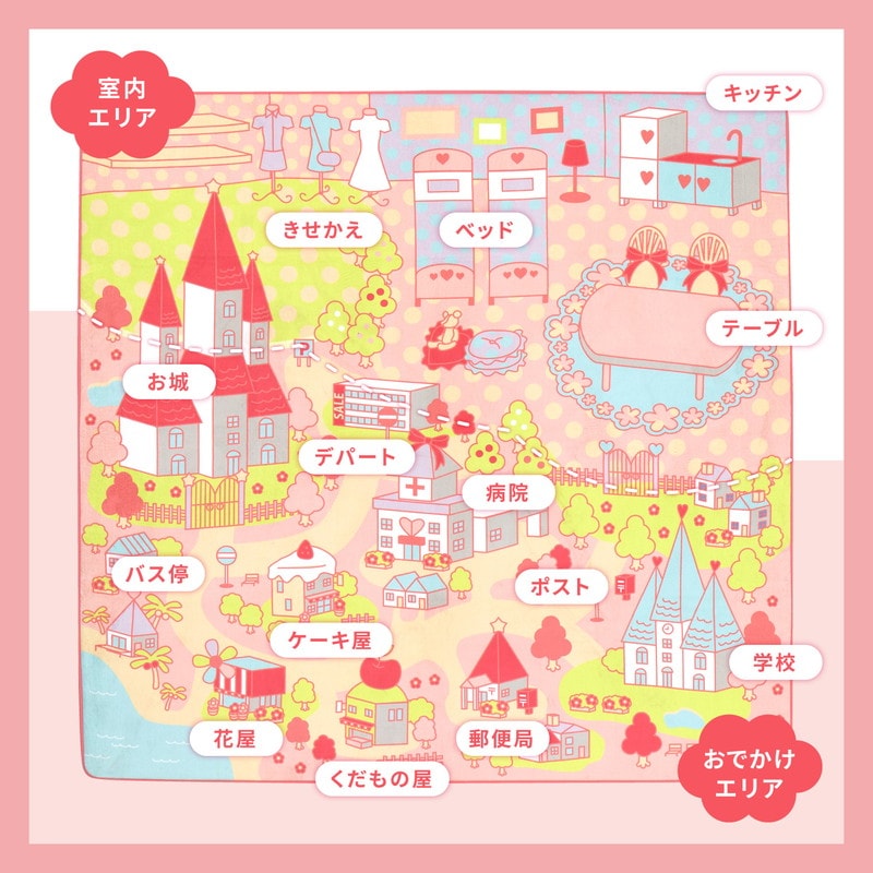 キッチンやベッドなどのお家エリア、学校や病院などのお出かけエリアと分かれており、こどもの想像力や遊び心をくすぐるデザインです。