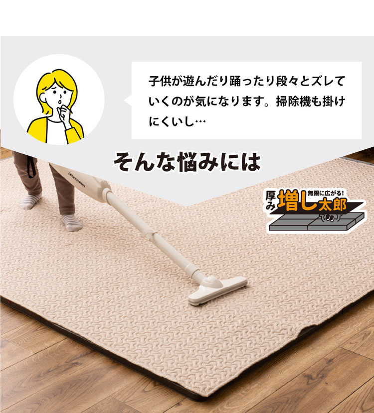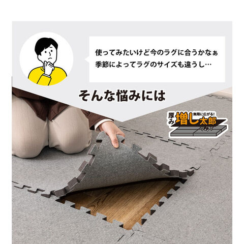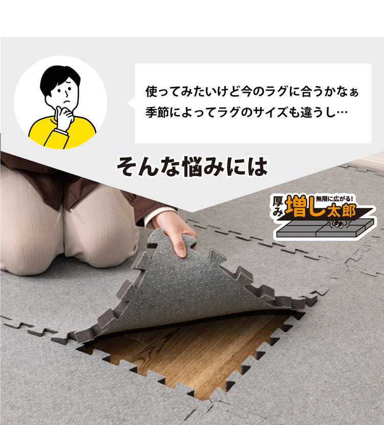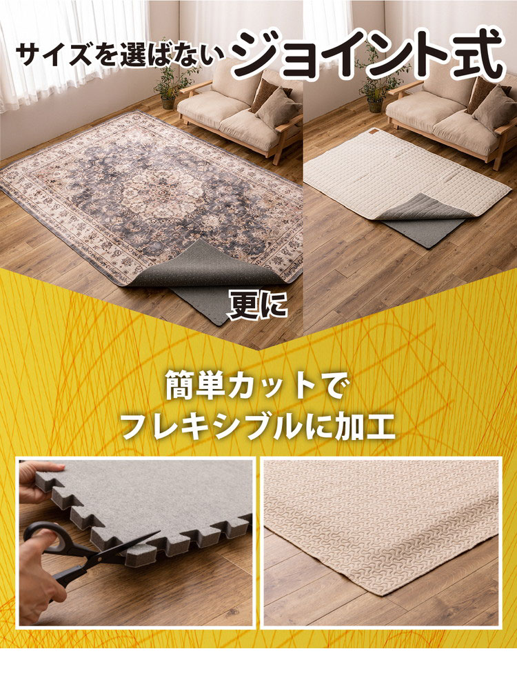 ■自分で繋げられるジョイント式だから、今お使いのラグに合わせられます。お気に入りのラグを買い替える必要なし!大きなラグもコンパクトなラグも、はみ出さないぴったりサイズにカスタマイズできます。