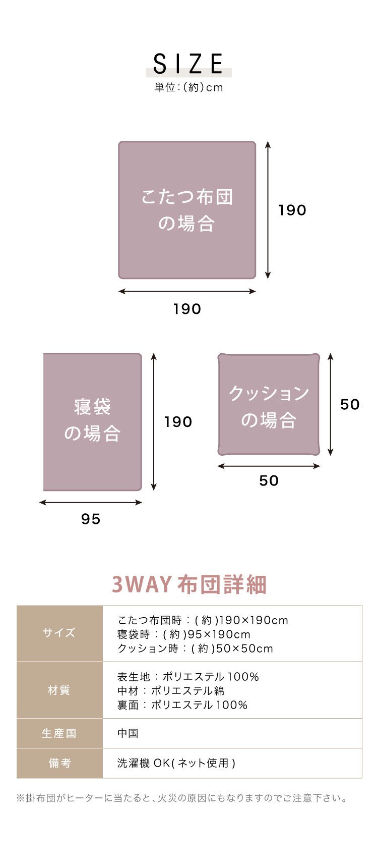 かさばらず、片付けも必要ない、新しい3WAY仕様のこたつ布団。