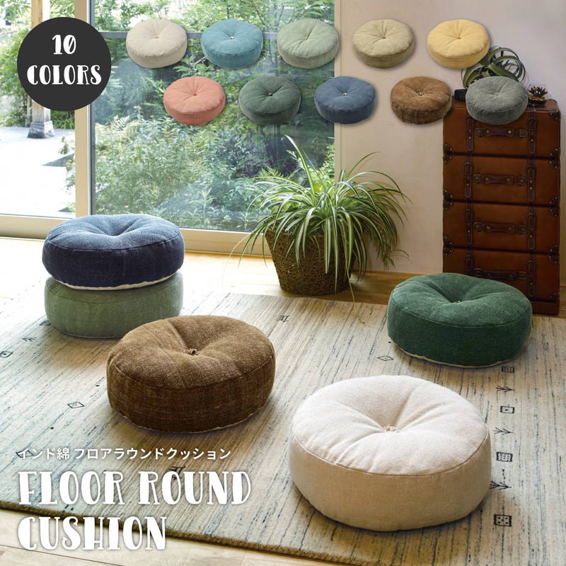 インド綿 フロアラウンドクッション 45R×12cm フロアクッション 丸 円形 座布団 お尻にフィット 背宛て 足置き 表面【送料無料】