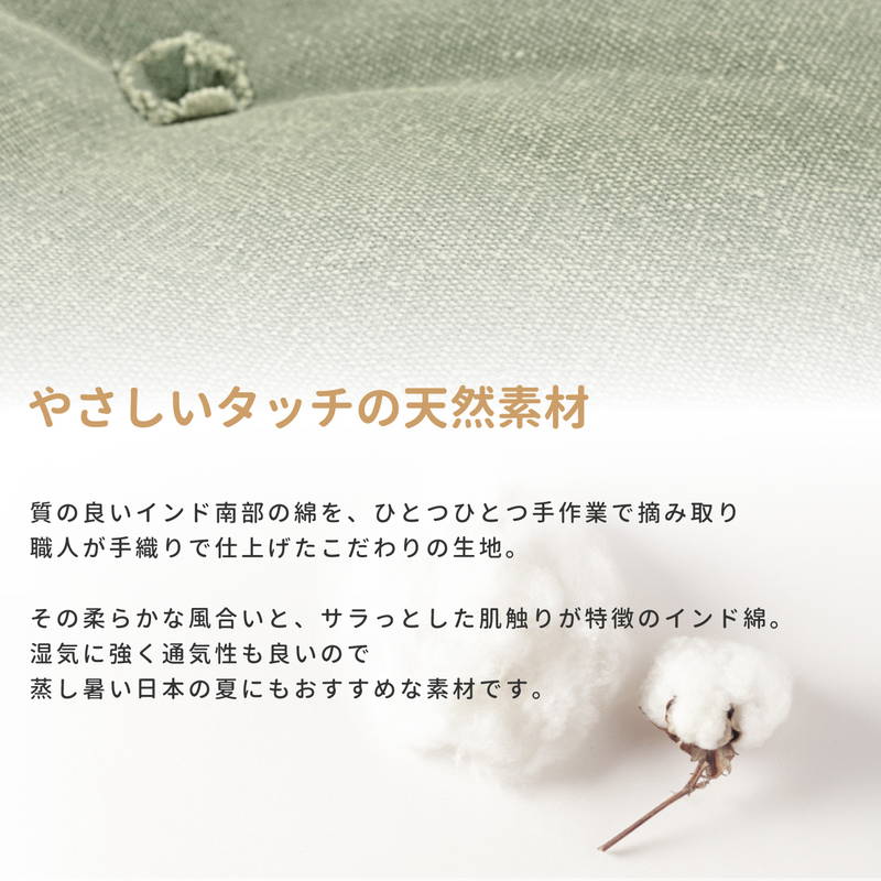 置くだけでオシャレ感が自然とアップしちゃうラウンドクション。表面は、コットン100%でさらりとした触り心地だから、オールシーズンOK!座面にくぼみがあるのでお尻にフィットして安定感も抜群です。足枕や背当てクッションなどとしても活躍。