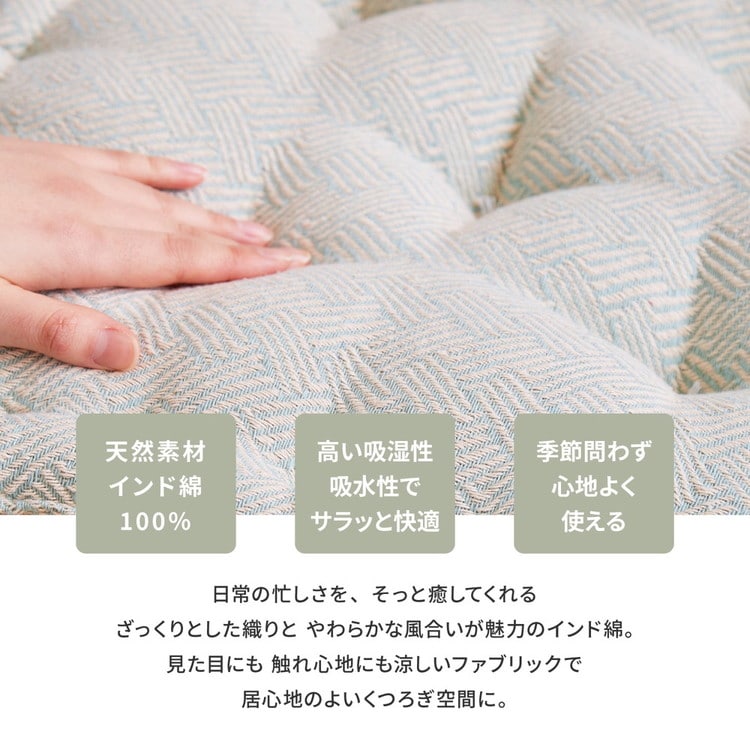 他の原産地の綿と比べ、ふんわりとした柔らかさがあるインド綿で作られたクッション。