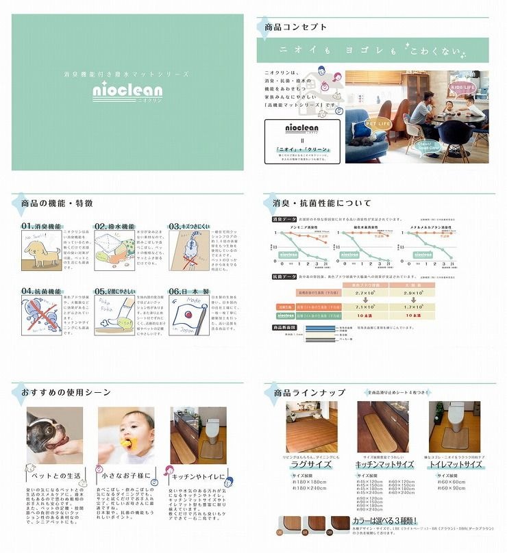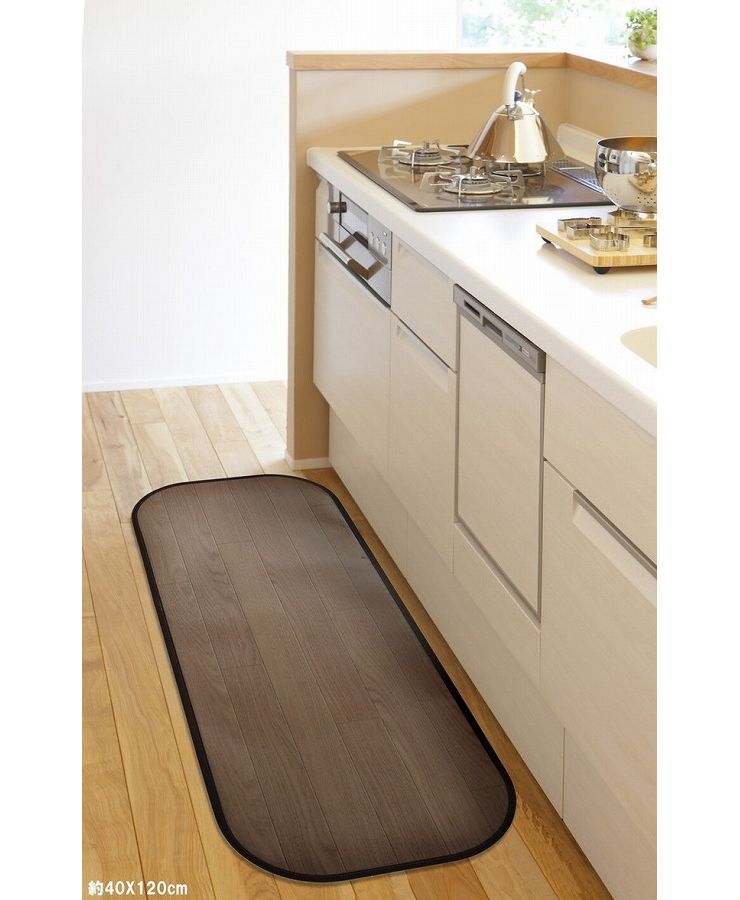 消臭・抗菌・撥水の機能をあわせもつ家族みんなにやさしい高機能な木目調フリーマット。水分が染み込まない素材なので、汚れがちなキッチンでもサッとひと拭きできれいに。水まわりの掃除が簡単で楽になるようサポート。さらにフローリングのような深い溝がないのも掃除がしやすいポイントです。4層構造による厚み約1.8mm(縁を除く)でほどよいクッション性があります。滑り止めシート4枚付きだからズレ対策も安心です。 サイズ:約90×120cm カラー:DBR 組成:表面:塩化ビニル樹脂