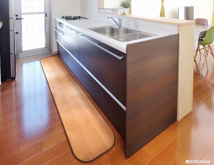 消臭・抗菌・撥水の機能をあわせもつ家族みんなにやさしい高機能な木目調フリーマット。水分が染み込まない素材なので、汚れがちなキッチンでもサッとひと拭きできれいに。水まわりの掃除が簡単で楽になるようサポート。さらにフローリングのような深い溝がないのも掃除がしやすいポイントです。4層構造による厚み約1.8mm(縁を除く)でほどよいクッション性があります。滑り止めシート4枚付きだからズレ対策も安心です。 サイズ:約90×240cm カラー:LBE 組成:表面:塩化ビニル樹脂