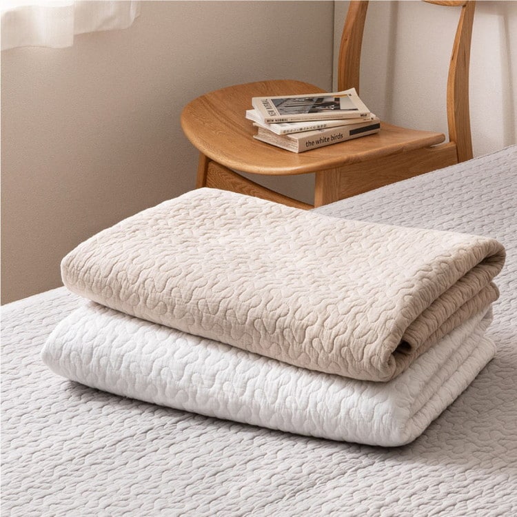 コットン100%で赤ちゃんの肌にもやさしく、中綿が入ったキルティング生地でふわっとやわらかな肌ざわりの敷きパッド。