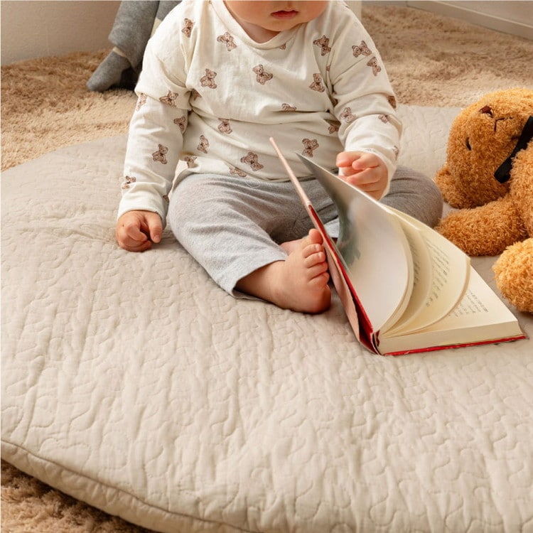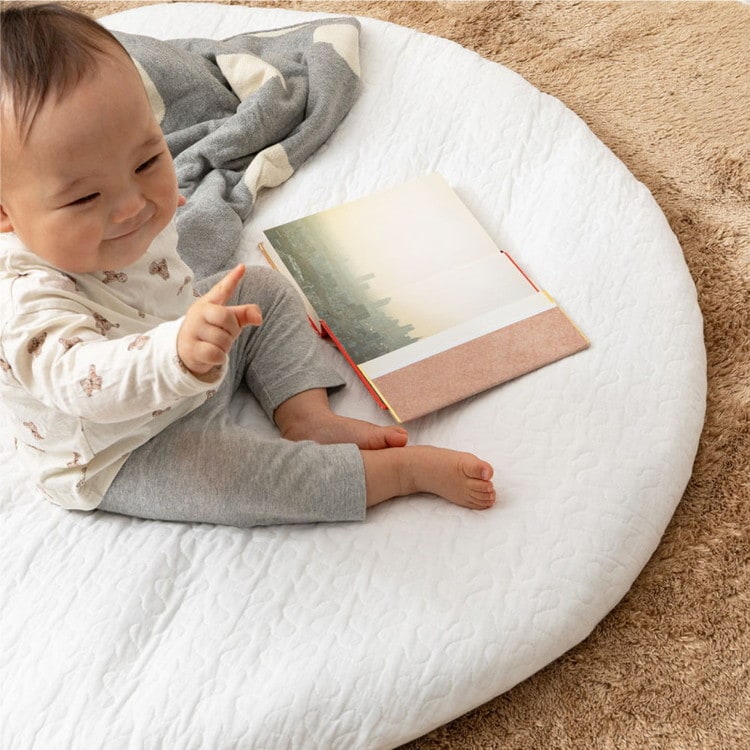 コットン100%で赤ちゃんの肌にもやさしく、まるいフォルムがかわいいベビーマット。
