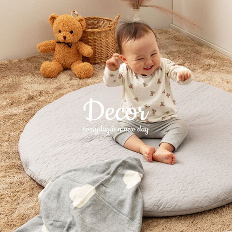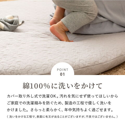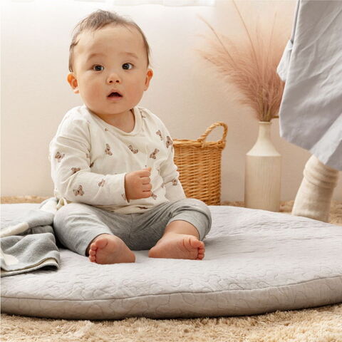 コットン100%で赤ちゃんの肌にもやさしく、まるいフォルムがかわいいベビーマット。