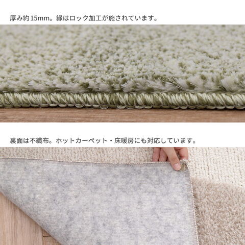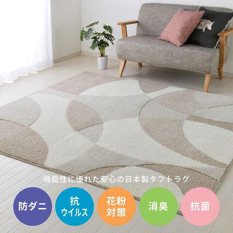 機能性に優れた安心の国産タフトラグ。ウィルスや花粉等のアレル物質を吸着分解、お家の中でも花粉対策!汗臭、加齢臭、アンモニア臭を消臭する効果もあります。裏面は不織布。ホットカーペット・床暖房に対応しています。
