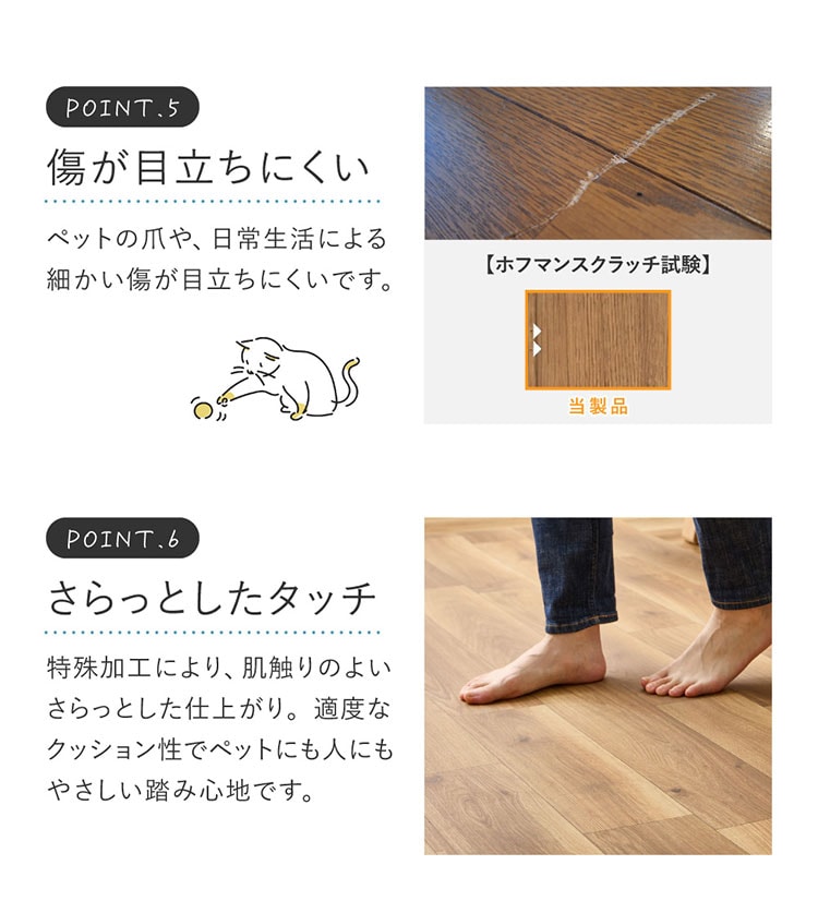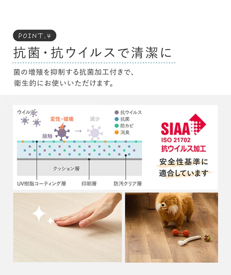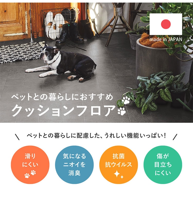 表面のコーティングによりワックスいらずでお手入れ簡単!防滑性・耐久性を備え傷がつきにくく、通常のクッションフロアより厚みがあり適度なクッション性でペットの足腰への負担を軽減します。抗菌・抗ウイルス機能付きで衛生面も安心。約90cm幅のマットサイズで使いやすく、カットもOK。また、複数枚を並べてお部屋に敷き詰めても◎