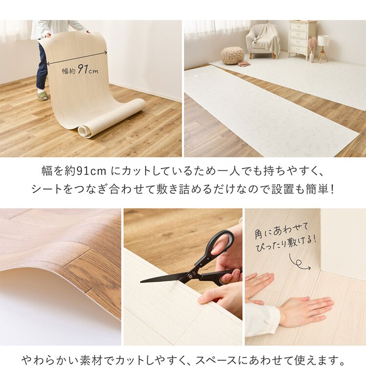 敷くだけで簡単に床の色を変えられるクッションフロア。お部屋の雰囲気がガラリと変えられるので気軽に模様替えができ、床への傷や汚れ防止にも!1枚の幅が約91cmずつにカットされているので扱いやすく、つなぎ合わせて敷き詰めるだけなので設置も簡単。やわらかい素材でカットしやすく、スペースにあわせてお使いいただけます。