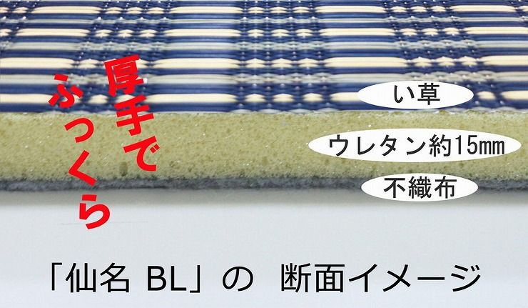 中材にウレタンを約15mm入れた3層構造のい草ラグです。
