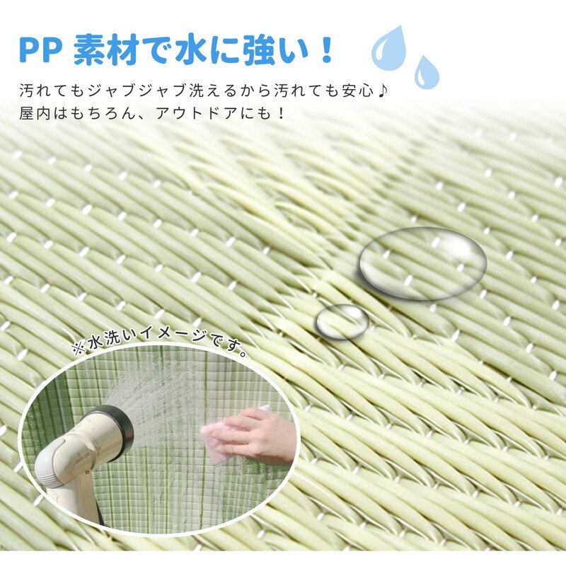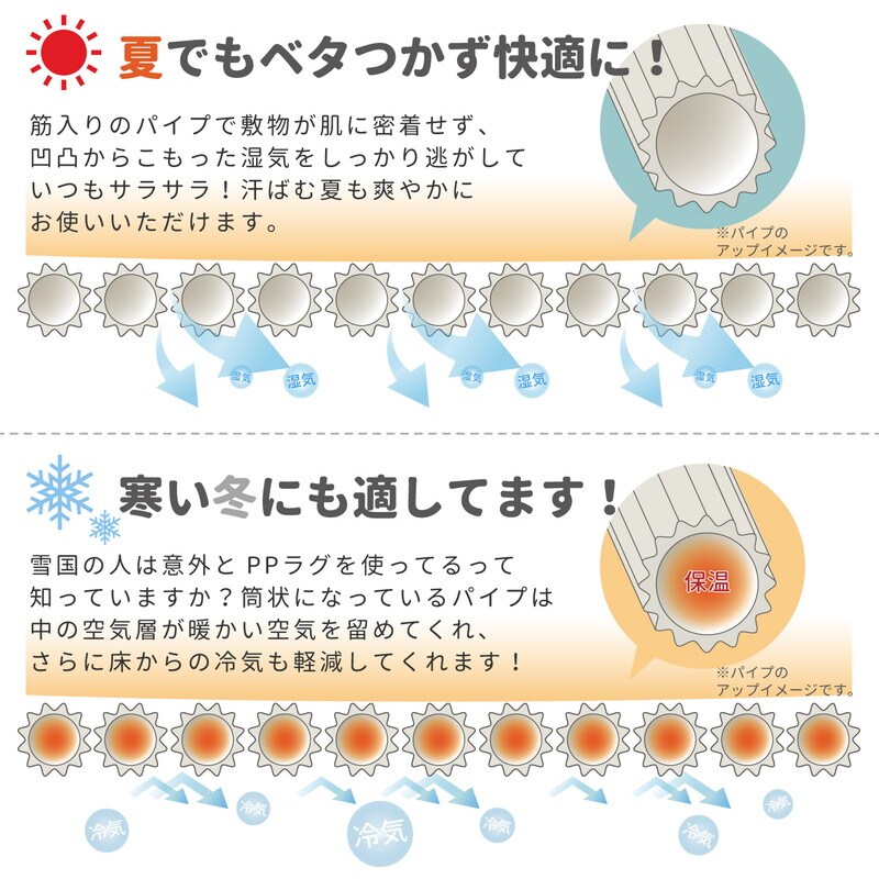 見た目はまるでい草のようなPP柄上敷き。抗菌加工付きで、細菌の増殖を抑制!お子さまやペットのいるご家庭も安心してお使いいただけます。水洗いできるので衛生的に、また海水浴場などの水辺でもお使いいただけます。また寒い地域ではビニール管内の空気層の保温効果を利用してあたたかく過ごすために冬に敷き詰めて使う家庭もあるそうです。