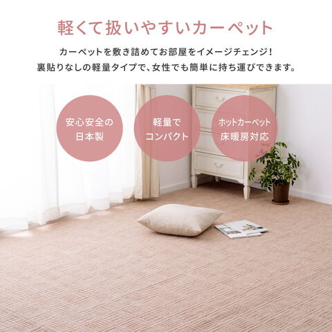超軽量カーペット。一人暮らしでも持ち運び簡単。弾力があり復元性に優れていてへたりにくく、ふかふかとした肌触りが特徴。